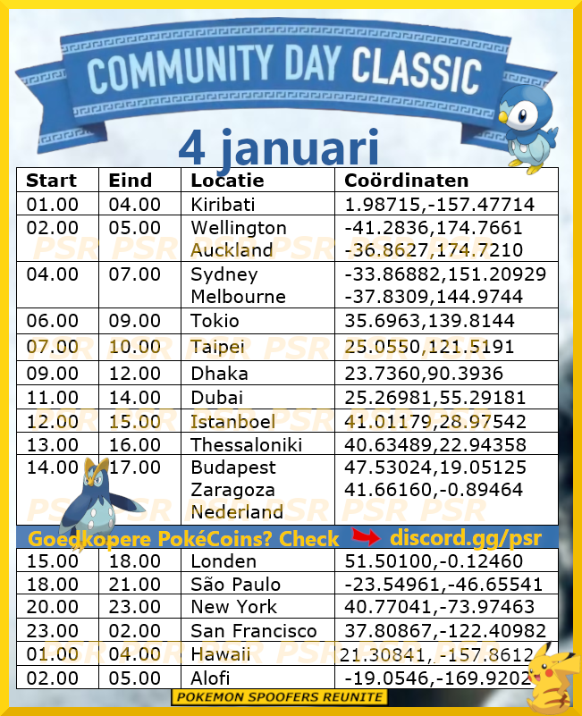 Op zondag 4 januari is de allereerste Community Day van het nieuwe jaar. Op deze dag zal Piplup voor de tweede keer centraal staan en veelvuldig te vangen zijn tussen 14.00 uur en 17.00 uur lokale tijd.