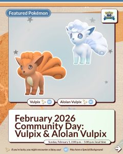 Op zondag 1 februari is het weer tijd voor een Community Day en dit keer staan Vulpix en Alolan Vulpix centraal. Tussen 14.00 uur en 17.00 uur lokale tijd kunnen we op deze Pokémon gaan jagen.