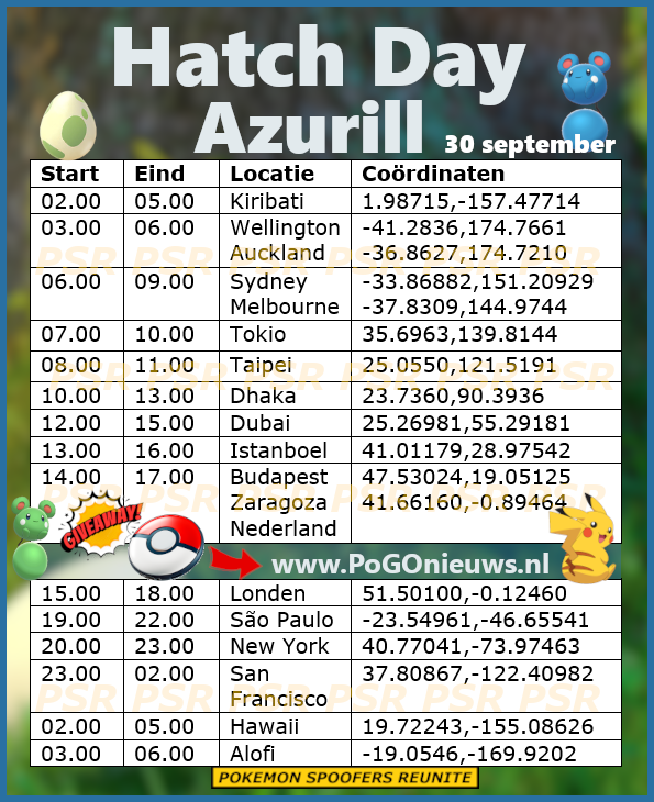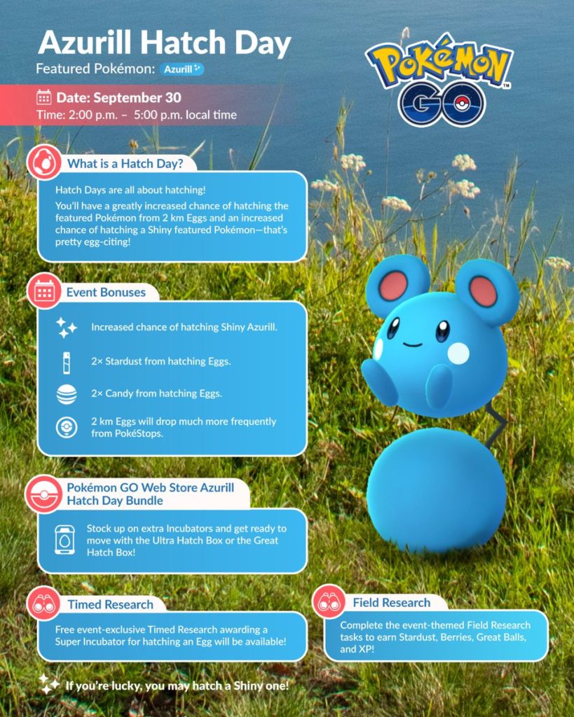 Op 30 september van 14.00 uur tot 17.00 uur is het Azurill Hatch Day. Dit is een speciaal klein evenement waarbij het volledig draait om het uitlopen van eitjes. Tijdens Hatch Day heb een verhoogde kans op Azurill uit de 2 km eieren. Ook heb je meer kans op een Shiny Azurill.