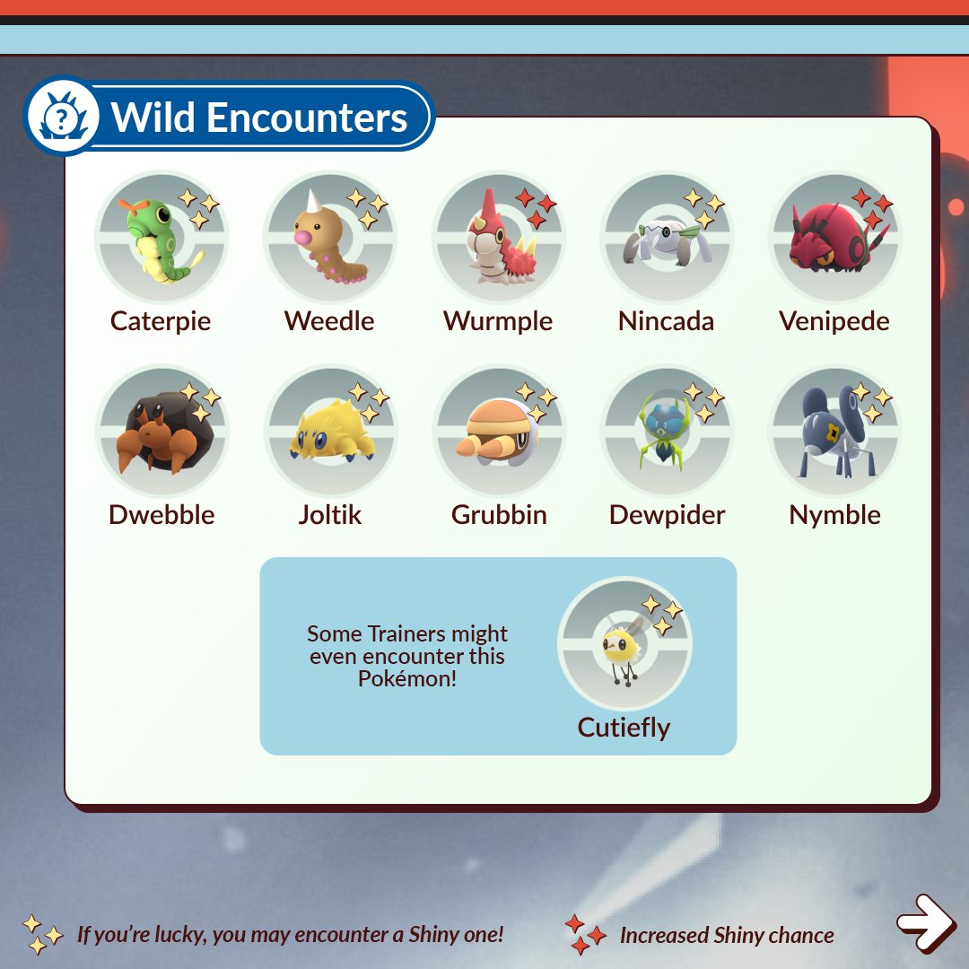 Tijdens het event zullen er veel Bug-type Pokémon in het wild voorkomen. Het gaat dan om Caterpie, Weedle, Wurmple, Nincada, Venipede, Dwebble, Joltik, Grubbin, Dewpider, Nymble en Cutiefly.