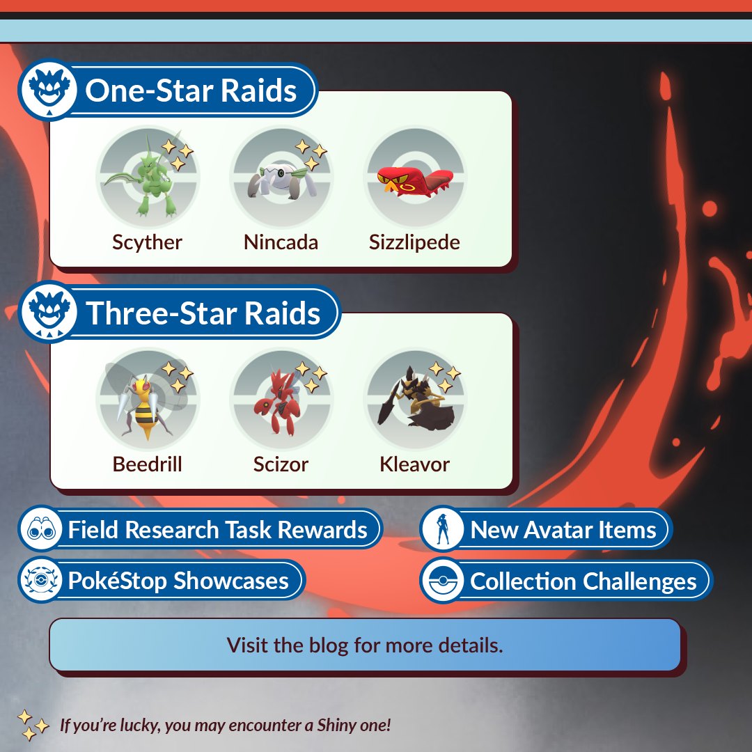 - Er zal een gratis Timed Research zijn waarmee je een Lure Module en Pokémon Shedinja, Sizzlipede en Kleavor kunt vrijspelen;