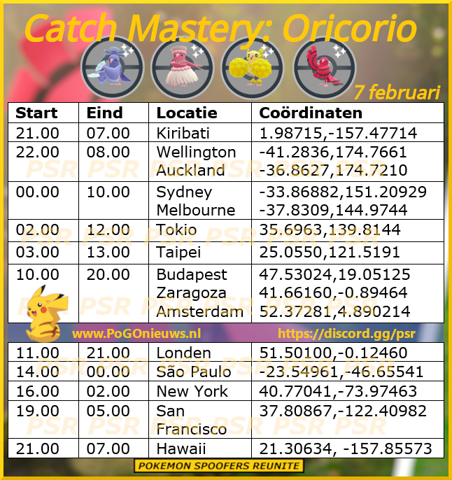 Op 7 februari is er een Catch Mastery die in het teken staat van Oricorio. Deze Pokémon heeft vier verschillende ‘vormen’ en deze zijn gebonden aan een regio. Tijdens dit event is er een verhoogde kans op een Shiny Oricorio. Je kunt Oricorio niet méér vinden in het wild, maar wel in de Field Research, Timed Research en een betaalde Timed Research.