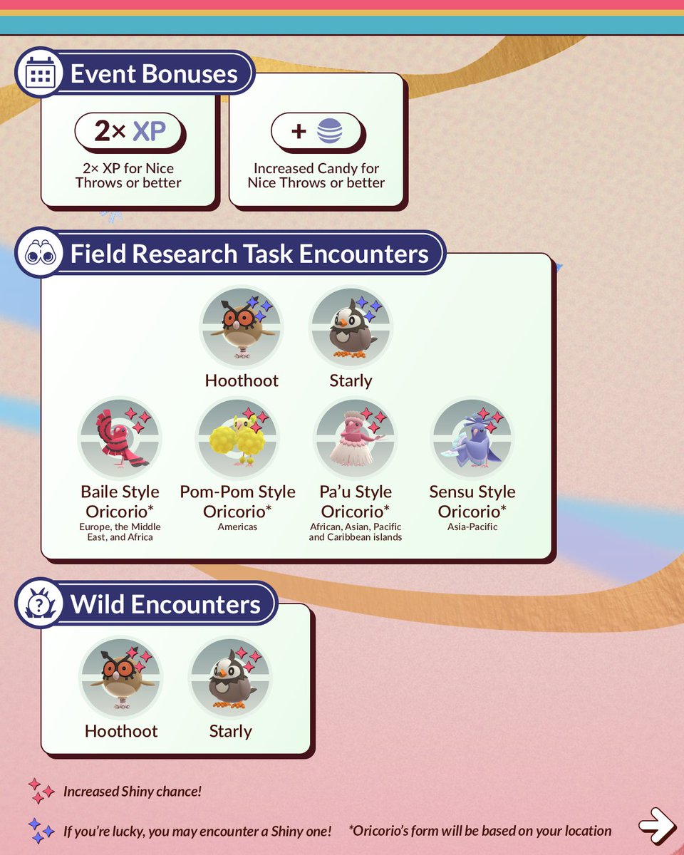 - Uit de Field Research taken kun je Hoothoot, Starly en Oricorio vrijspelen;