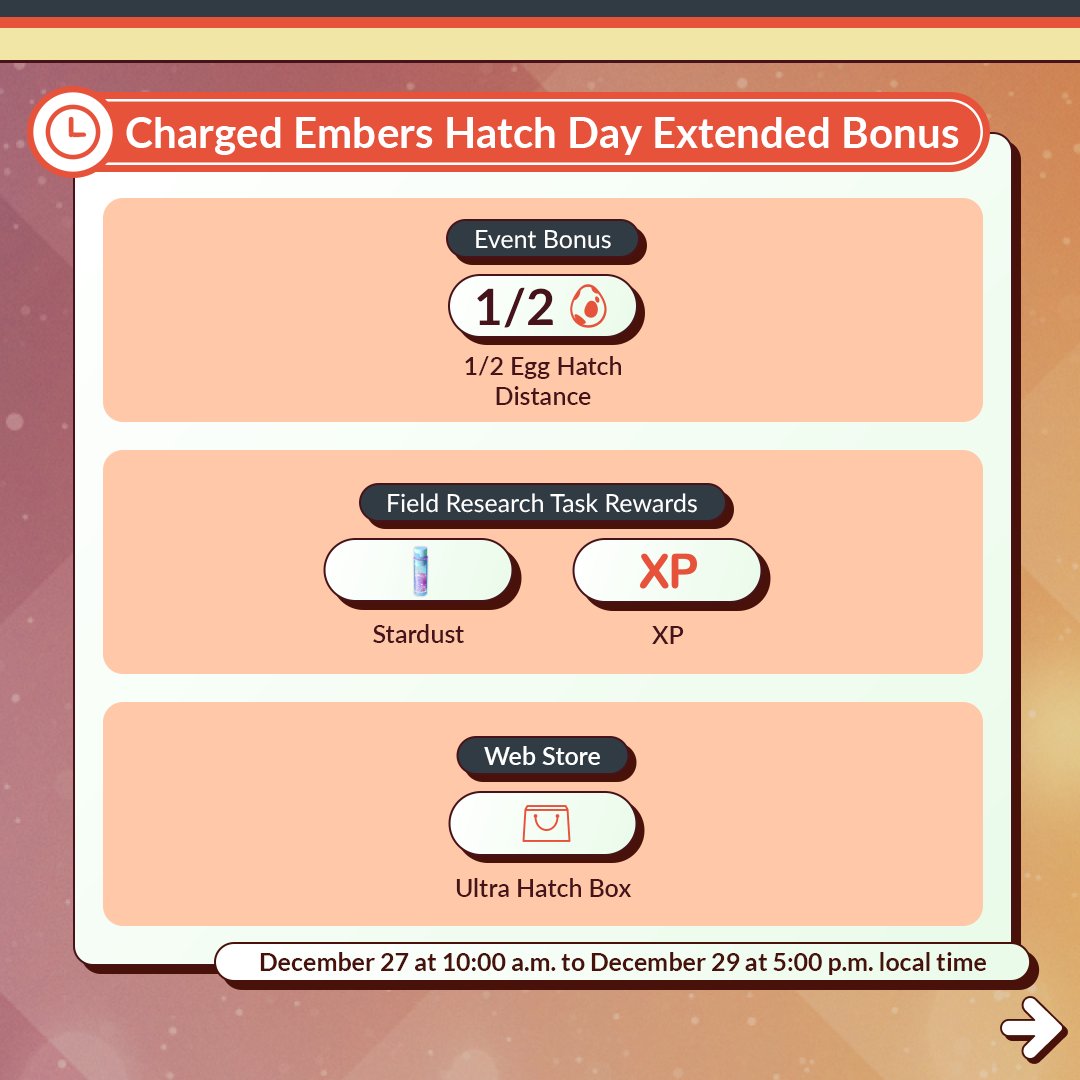 Op zondag 29 december 2024 van 14.00 uur tot 17.00 uur lokale tijd zal er weer een Hatch event plaatsvinden. Tijdens dit Hatch event zullen de Pokémon Magby en Elekid centraal staan. Deze Pokémon zullen meer hatchen uit 2 km eieren en hebben ook een verhoogde Shiny kans!