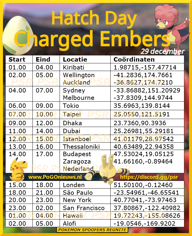 Op zondag 29 december 2024 van 14.00 uur tot 17.00 uur lokale tijd zal er weer een Hatch event plaatsvinden. Tijdens dit Hatch event zullen de Pokémon Magby en Elekid centraal staan. Deze Pokémon zullen meer hatchen uit 2 km eieren en hebben ook een verhoogde Shiny kans!