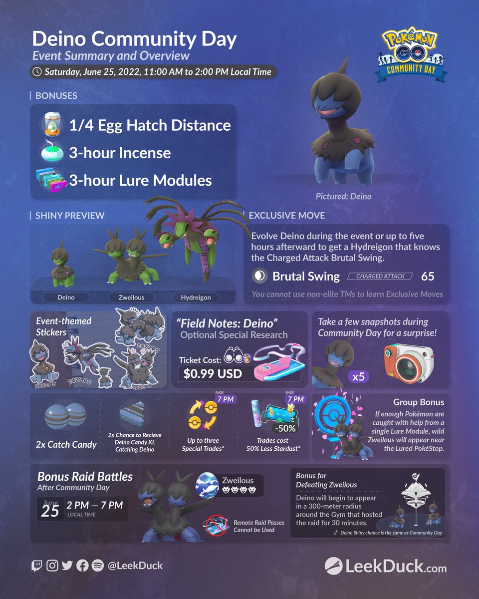 Aansluitend aan de Community Day uren zal Zweilous als 4 sterren raidbaas komen. Als je een Zweilous raid hebt gedaan, dan zal gedurende 30 minuten Deino in een straal van 300 meter rondom de gym meer voorkomen. Deze Deino hebben dezelfde Shiny rate als tijdens de eerdere uren. Een Zweilous raid zal alleen mogelijk zijn met een Raid Pass en een Premium Battle Pass, dus niet met een Remote raidpas. Dit zal actief zijn van 14.00 uur tot 17.00 uur lokale tijd.
