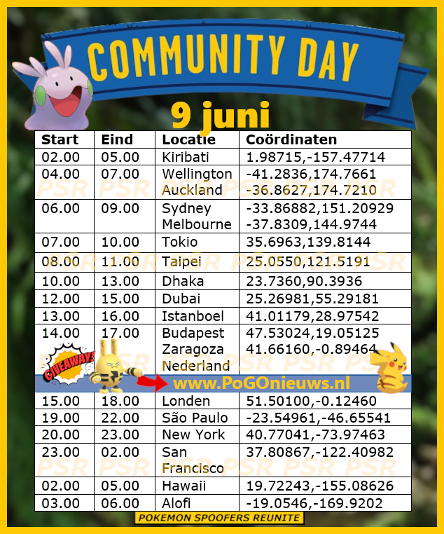 Op zondag 9 juni van 14.00 uur tot 17.00 uur lokale tijd zal er weer een Community Day plaatsvinden en dit keer staat Goomy in het middelpunt. Goomy is al Shiny in het spel en zal tijdens dit event met een verhoogde Shiny kans te verkrijgen zijn. Een goede kans om de Shiny familie compleet te maken. Als je Goomy evolueert tijdens het event of 5 uur na het einde van het event, dan zal Sliggoo de move Thunder Punch hebben.