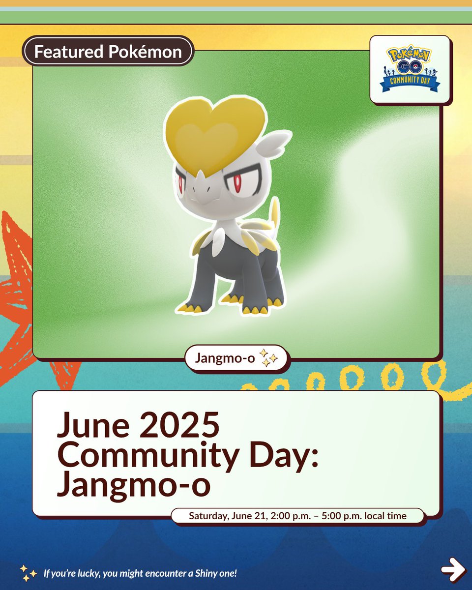 Op zaterdag 21 juni zal er weer een Community Day plaatsvinden en dit keer staat Jangmo-o centraal. Deze Pokémon is al Shiny in het spel te verkrijgen, maar lang niet iedereen heeft deze al Shiny in zijn collectie. Het zal dus voor veel trainers weer een leuke Community Day worden! Tussen 14.00 uur en 17.00 uur lokale tijd zal dit event actief zijn.