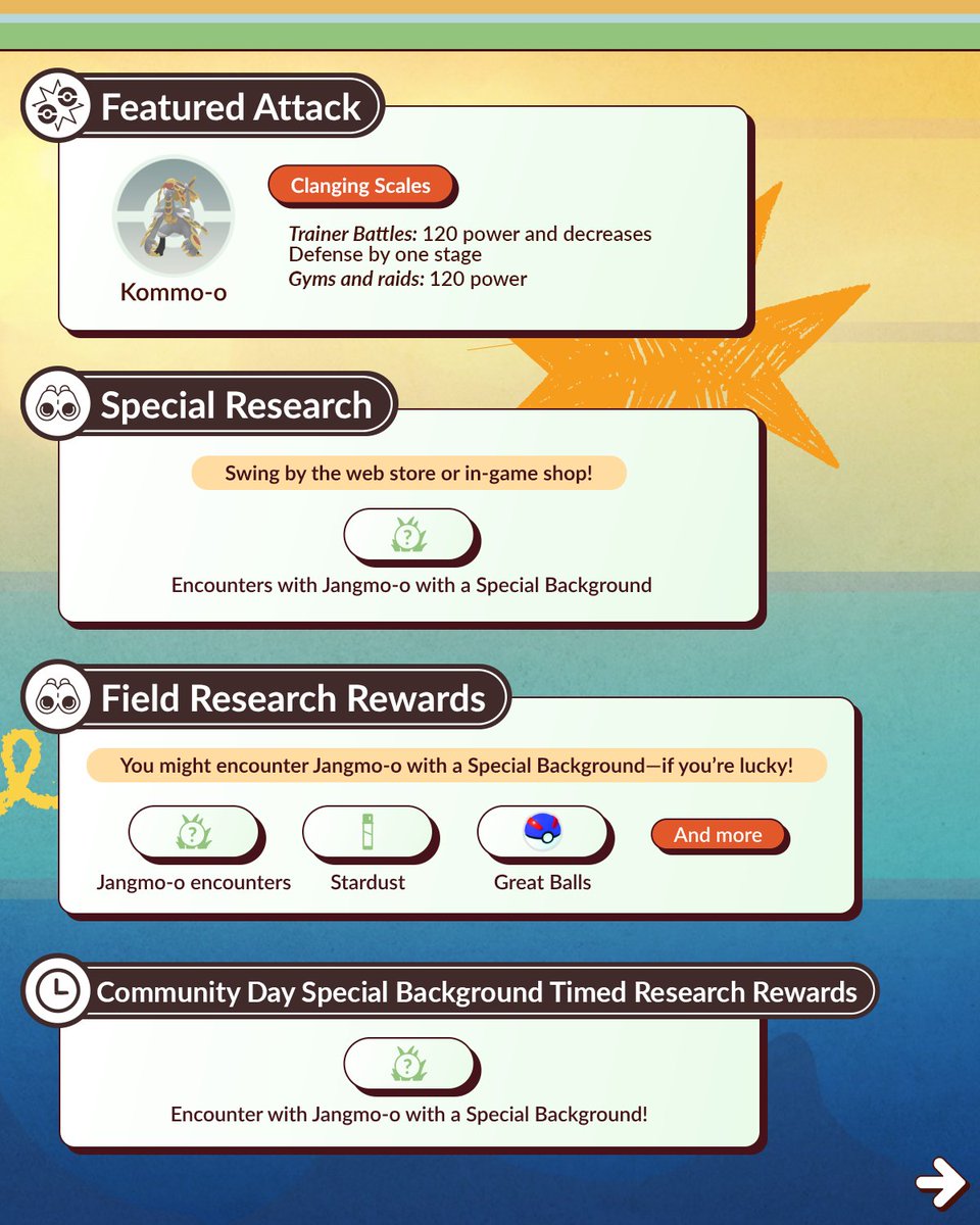 Als je Community Day meespeelt zal je ook een Community Day Special Background Timed Research ontvangen. Deze research zal na 28 juni verlopen, maar je kunt hieruit ook een Jangmo-o met een Special Background vrijspelen.