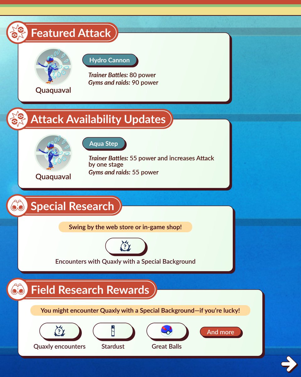 - De Field Research taken zullen weer aangepast zijn op het event. Je kunt hiermee een Quaxly vrijspelen die een Special Background heeft.