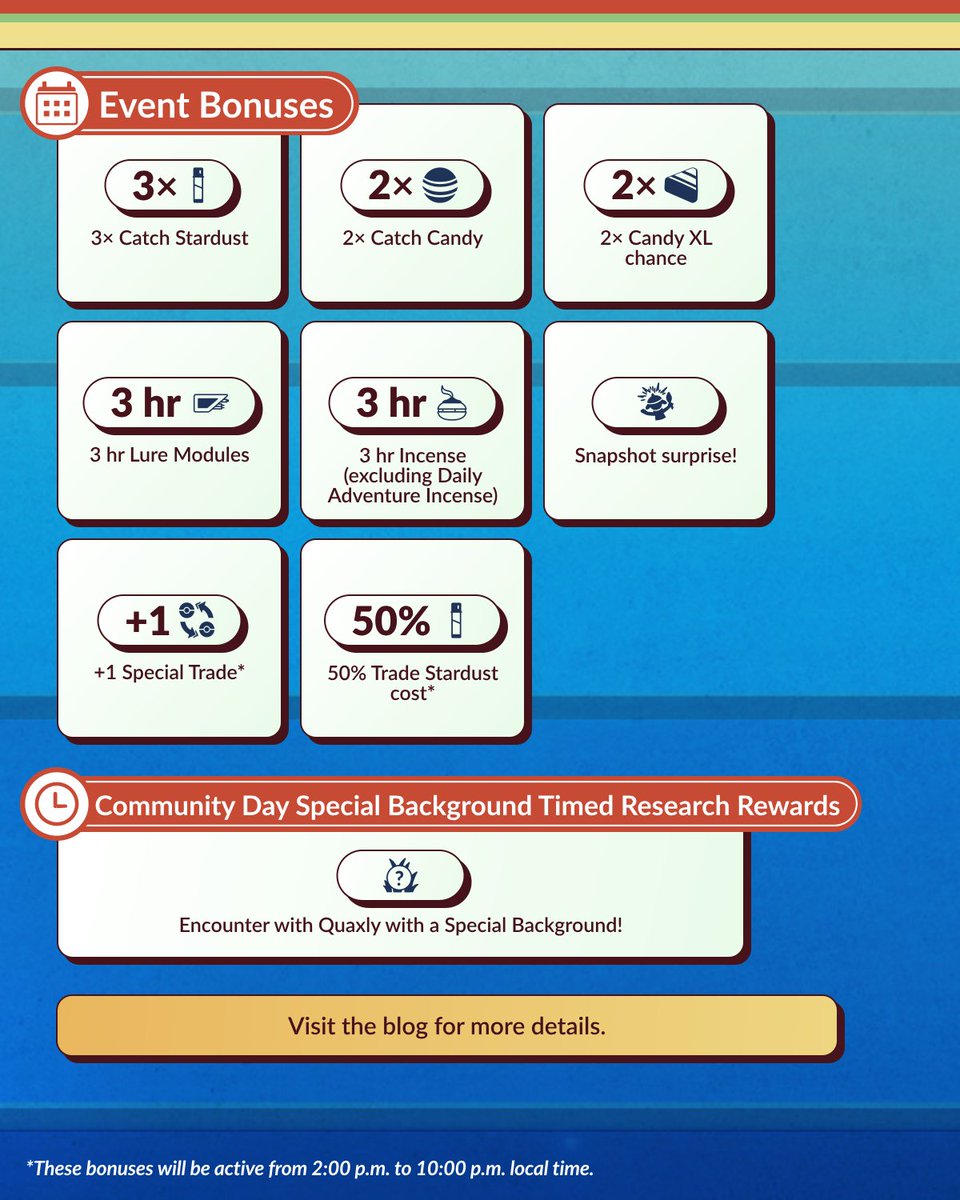 Als je dit event meespeelt krijg je ook een Timed Research die nog 7 dagen na het event actief is. Met deze research kun je ook Quaxly met een Special Background vrijspelen en deze heeft (ook na Community Day) een verhoogde kans om Shiny te zijn.