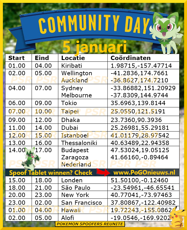 Op zondag 5 januari van 14.00 uur tot 17.00 uur lokale tijd is er weer Community Day. Deze keer zal Sprigatito centraal staan. Sprigatito zal tijdens dit event zijn Shiny debuut maken en de kans om deze Pokémon Shiny aan te treffen zal flink verhoogd zijn.