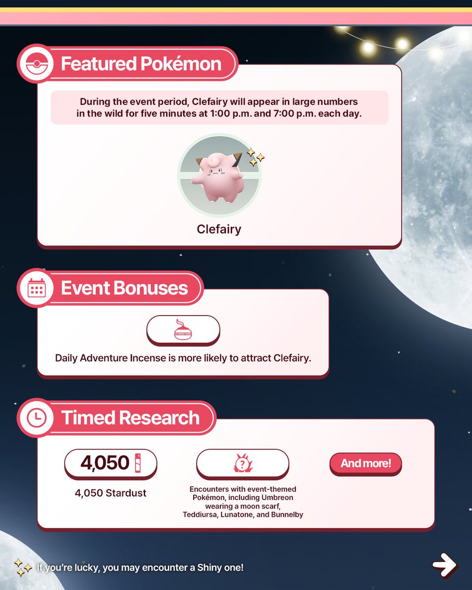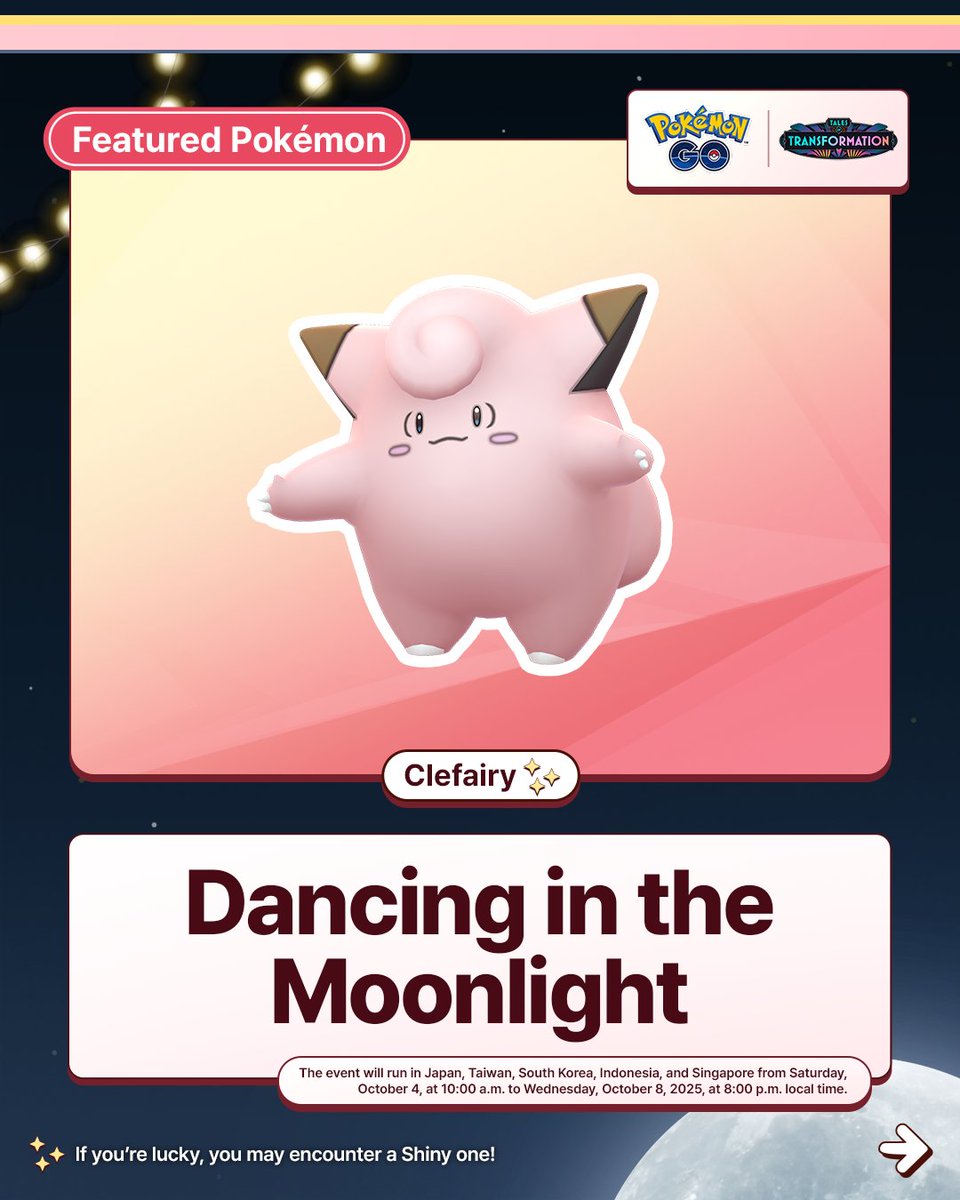Dit weekend hebben we meerdere events want naast Raid Day zal ook het Dancing in the Moonlight event starten. Het Dancing in the Moonlight event is een lokaal te spelen. In Japan, Taiwan, Hong Kong, Indonesië en Singapore kun je voor 5 minuten heel veel Clefairy in het spel tegenkomen. Het event start op 4 oktober en zal eindigen op 8 oktober.
