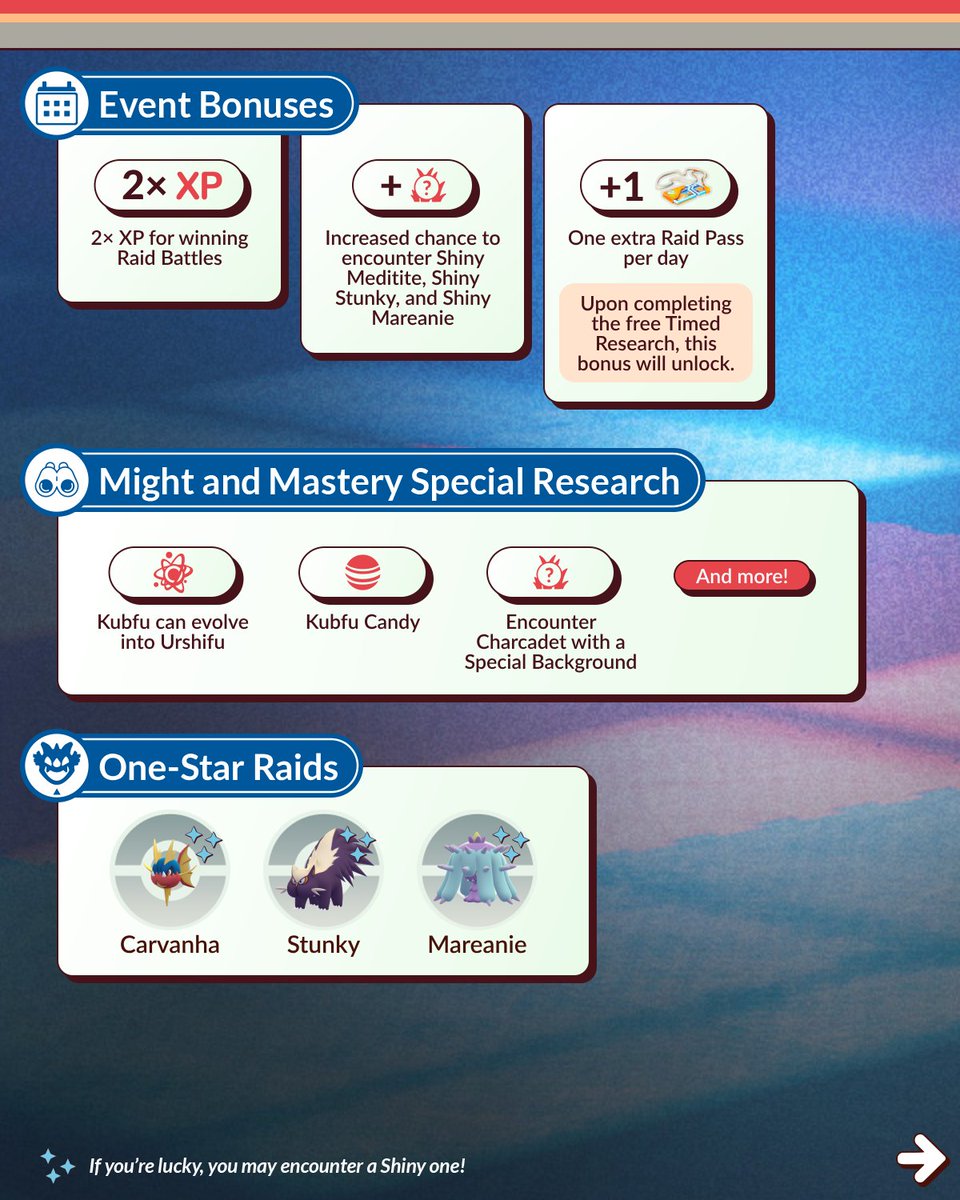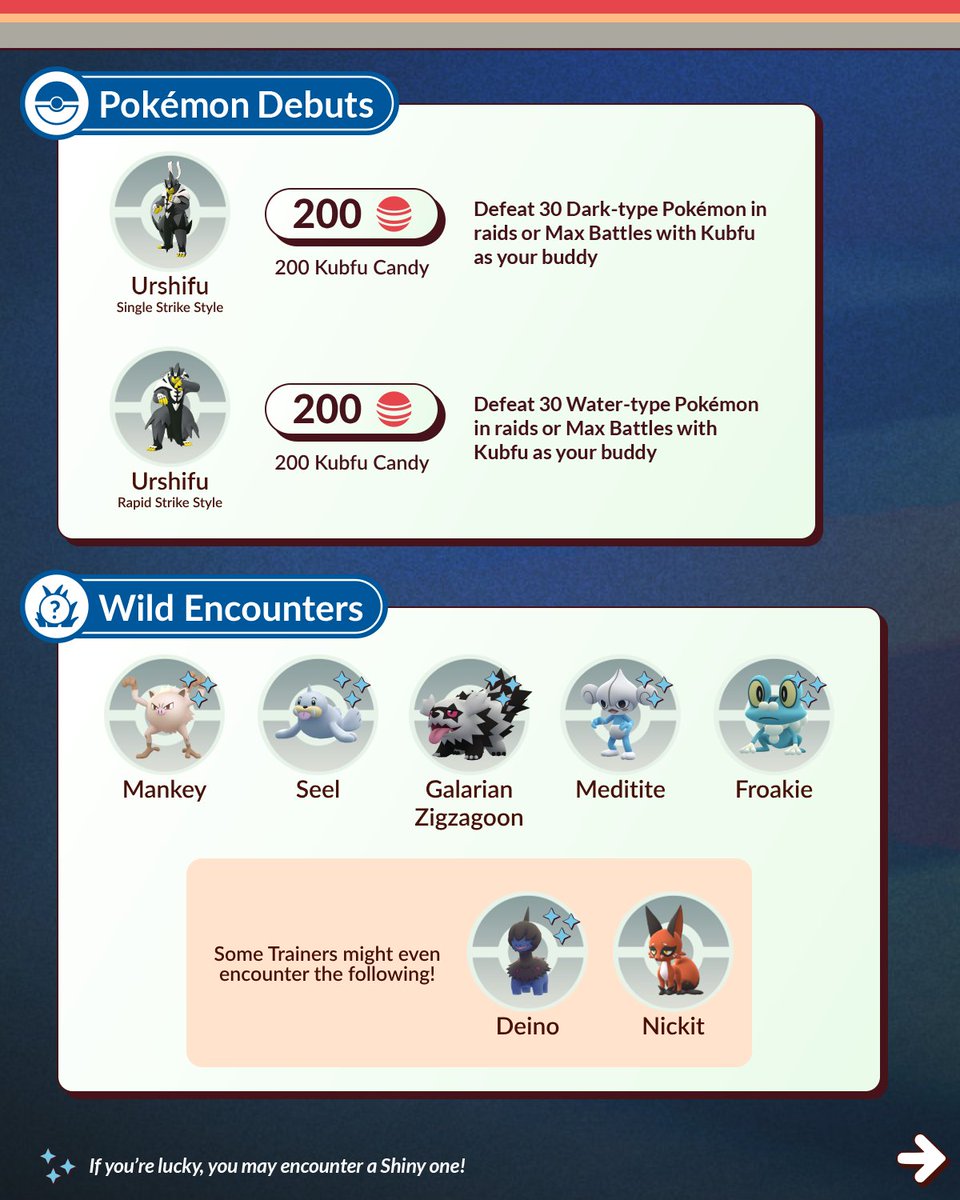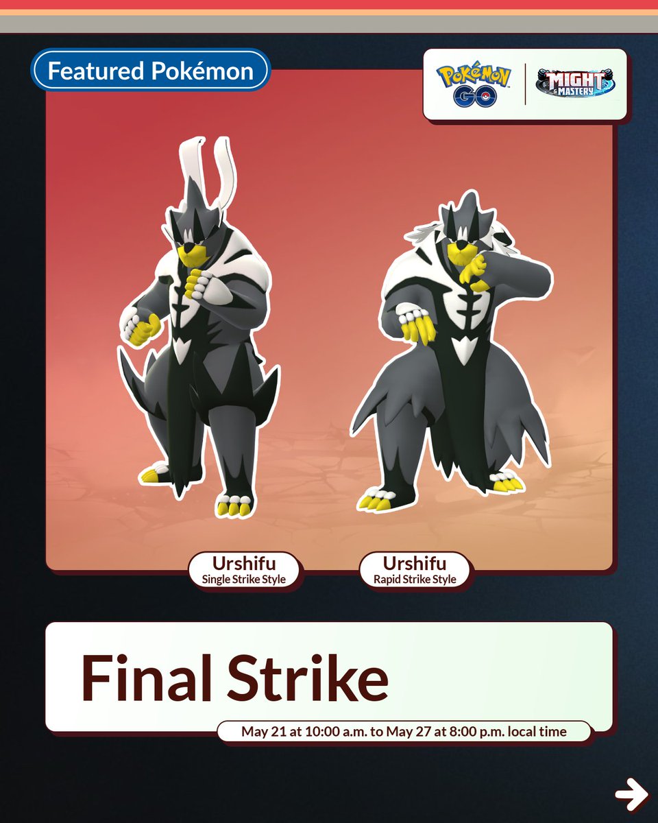 Er komt een GO Battle Week aan die in het teken staan van de evolutie van Kubfe, namelijk Urshifu. Vanaf 21 mei om 10.00 uur lokale tijd kunnen we deze Pokémon toevoegen aan onze PokéDex. Ook zal de Might and Mastery Special Research verder gaan en daarmee kunnen we zelfs Charcadet met een Special Background uit vrijspelen. Dit event zal op 27 mei om 20.00 uur eindigen.