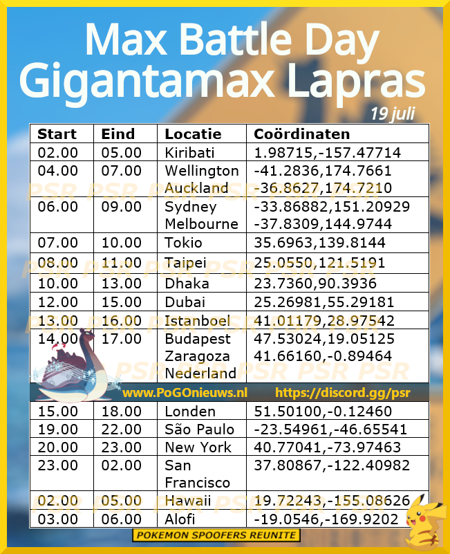 Op zaterdag 19 juli is er een Gigantamax Lapras Max Battle Day van 14.00 uur tot 17.00 lokale tijd. Als je geluk heb kan je ook een Shiny krijgen.
