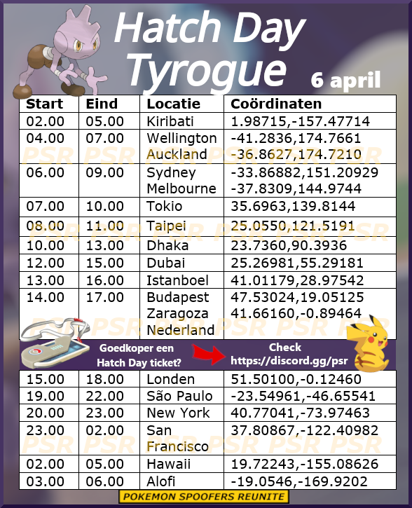 Op zondag 6 april van 14.00 uur tot 17.00 uur lokale tijd is er weer een Hatch Day. Deze keer staat Tyrogue centraal en kunnen we deze Pokémon uit 2km eieren hatchen. Voordat we aan dit event kunnen starten zullen er ook al bonussen actief zijn.