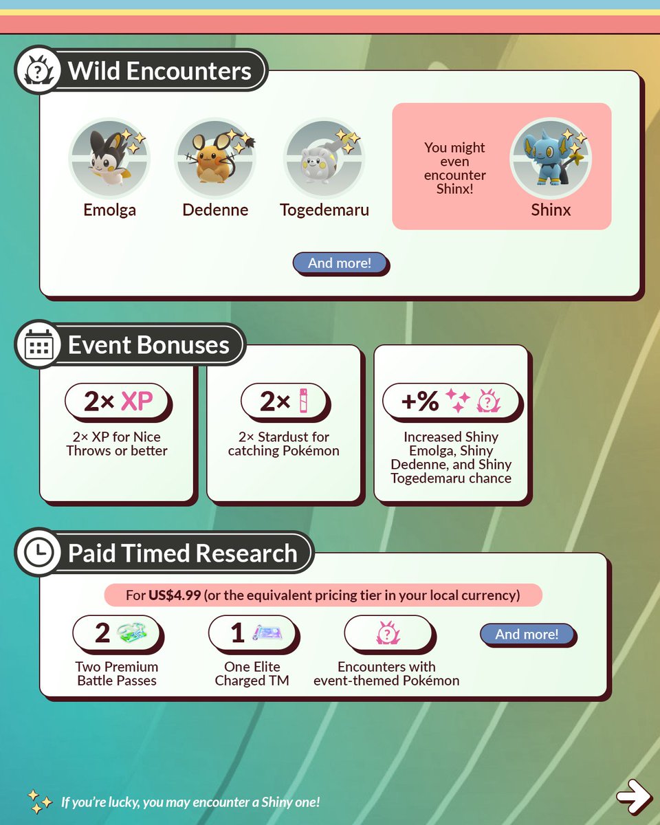 - Verhoogde kans om de volgende Pokémon Shiny te vinden: Emolga, Dedenne en Togedemaru.