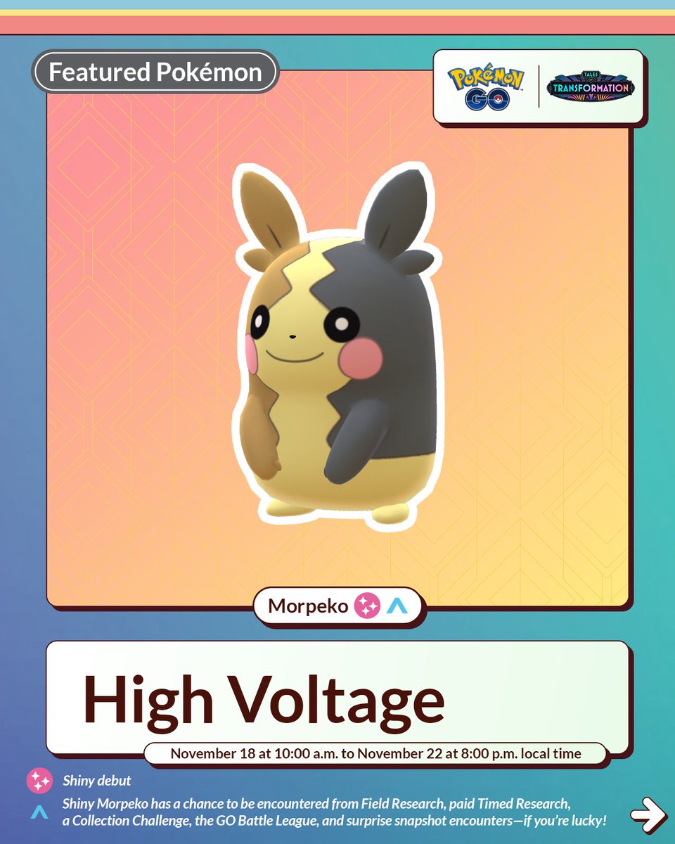 Op dinsdag 18 november start er alweer een nieuw event namelijk High Voltage. Voor de eerste keer kunnen we Morpeko tegenkomen in het spel. Morpeko is direct ook Shiny te verkrijgen. Het event zal eindigen op zaterdag 22 november om 20.00 uur lokale tijd.