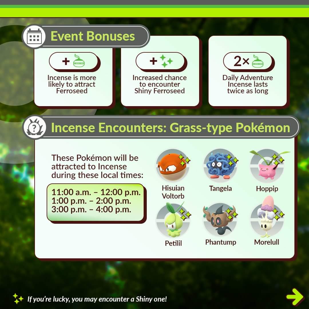Niet alleen Ferroseed zal op Incense afkomen. Ook zullen er verschillende Grass-type en Steel-type Pokémon tevoorschijn komen. Deze twee type Pokémon wisselen elkaar elk uur af.