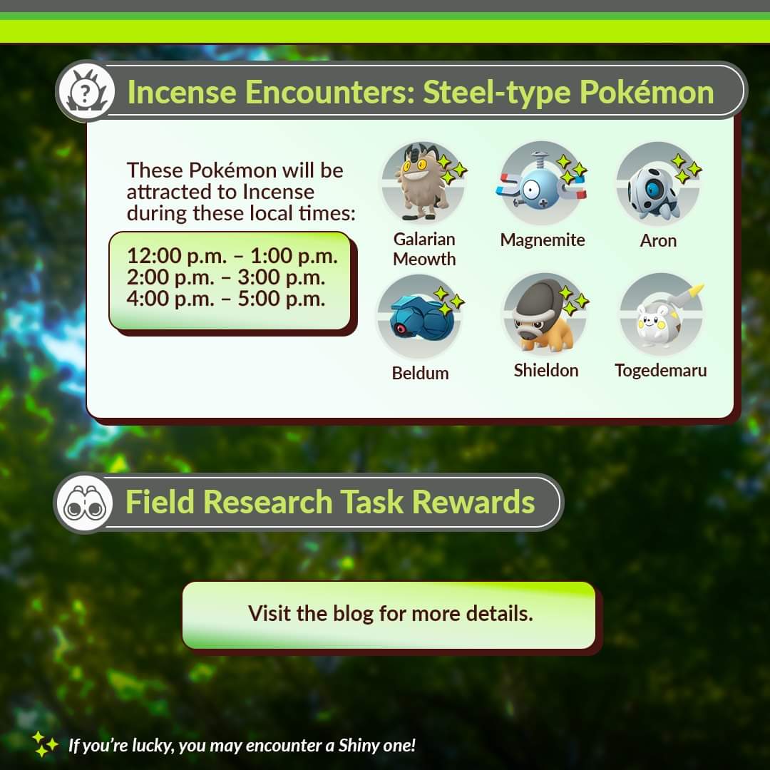 De Grass-type Pokémon die meer zullen voorkomen zijn: Hsuian Voltorb, Tangela, Hoppip, Petilil, Phantump en Morelull. Steel-type Pokémon die meer zullen voorkomen zijn: Galarian Meowth, Magnemite, Aron, Beldum, Shieldon en Togedemaru.