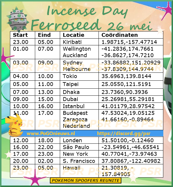 Er komt weer een Incense Day aan en dit keer staat Ferroseed centraal. Op 26 mei van 11.00 uur tot 17.00 uur lokale tijd zullen we vanuit Incense meer kans maken op een Shiny Ferroseed. Deze Pokémon is natuurlijk al eventjes Shiny in het spel, maar wellicht mis je Ferrothorn nog Shiny. Een ideale gelegenheid om je collectie compleet te maken.