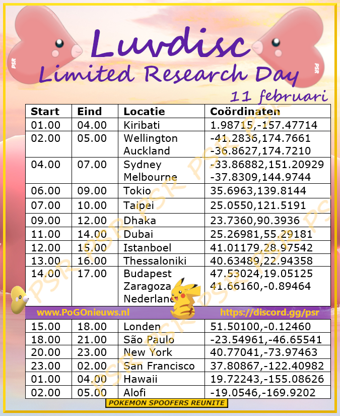 In het Valentijns event krijgen we ook een Research Day en dat betekent dat er Field Research taken zullen zijn waarmee we Luvdisc kunnen vrijspelen. Deze Field Research haal je uit de Pokéstops. Dit kleine event zal op 11 februari van 14.00 uur tot 17.00 uur in de lokale tijd plaatsvinden. De wilde spawns zullen met dit event ook iets veranderen.