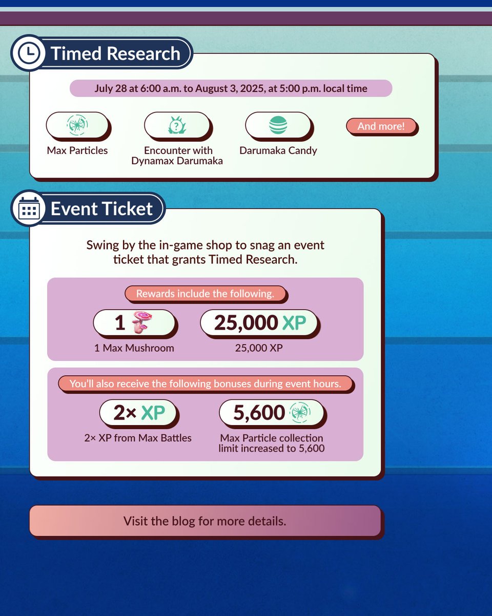 Vanaf 28 juli kun je in het spel een Timed Research ontvangen. Met deze research kun je een Dynamax Pokémon (Dynamax Darumaka) die handig is bij de battles tegen Gigantamax Butterfree vrijspelen. Ook krijg je extra Candy en Max Particles vanuit deze research.