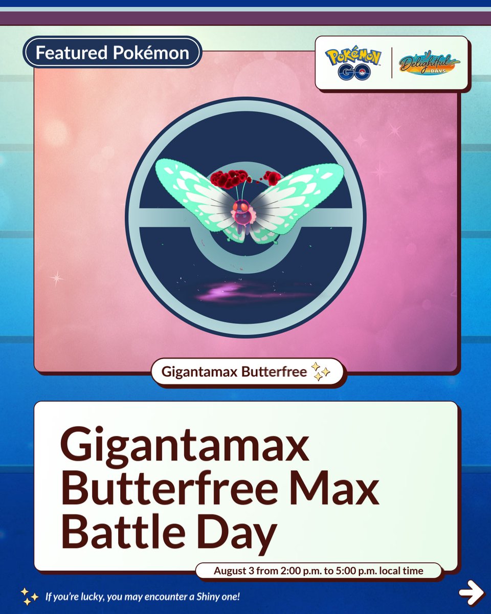 Op zondag 3 augustus van 14.00 uur tot 17.00 uur lokale tijd kunnen we Gigantamax Butterfree in de Max Battles aantreffen. Deze Pokémon maakt hiermee zijn spel debuut en je kunt een Shiny Butterfree vrijspelen uit de Max Battles.