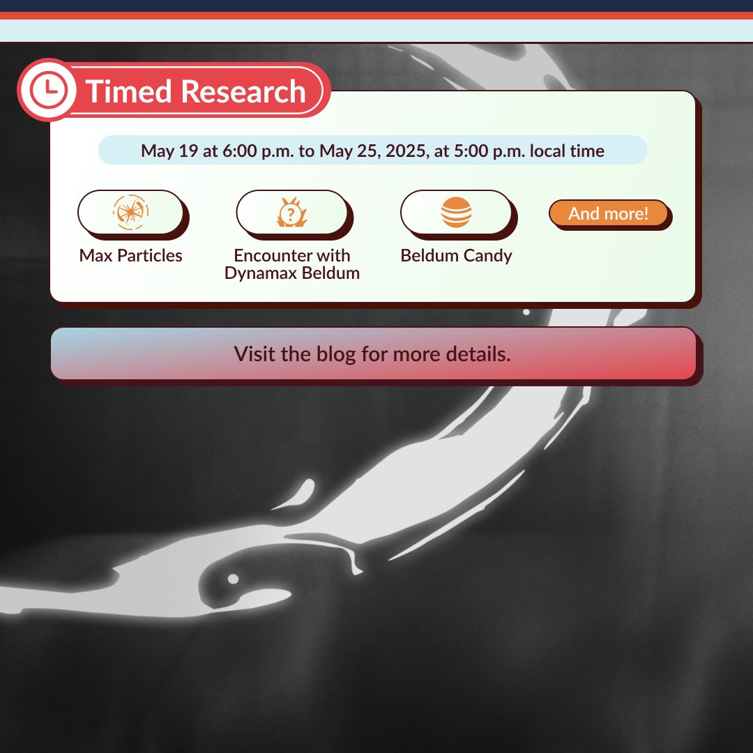 Er is op 19 mei een Timed Research beschikbaar waarmee je Dynamax Pokémon die sterk in de battles tegen Gigantamax Machamp zijn kunt vrijspelen. Dit keer kun je Dynamax Beldum vrijspelen. Deze Timed Research verloopt na het event.