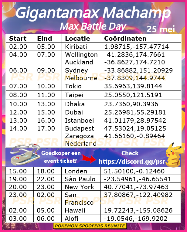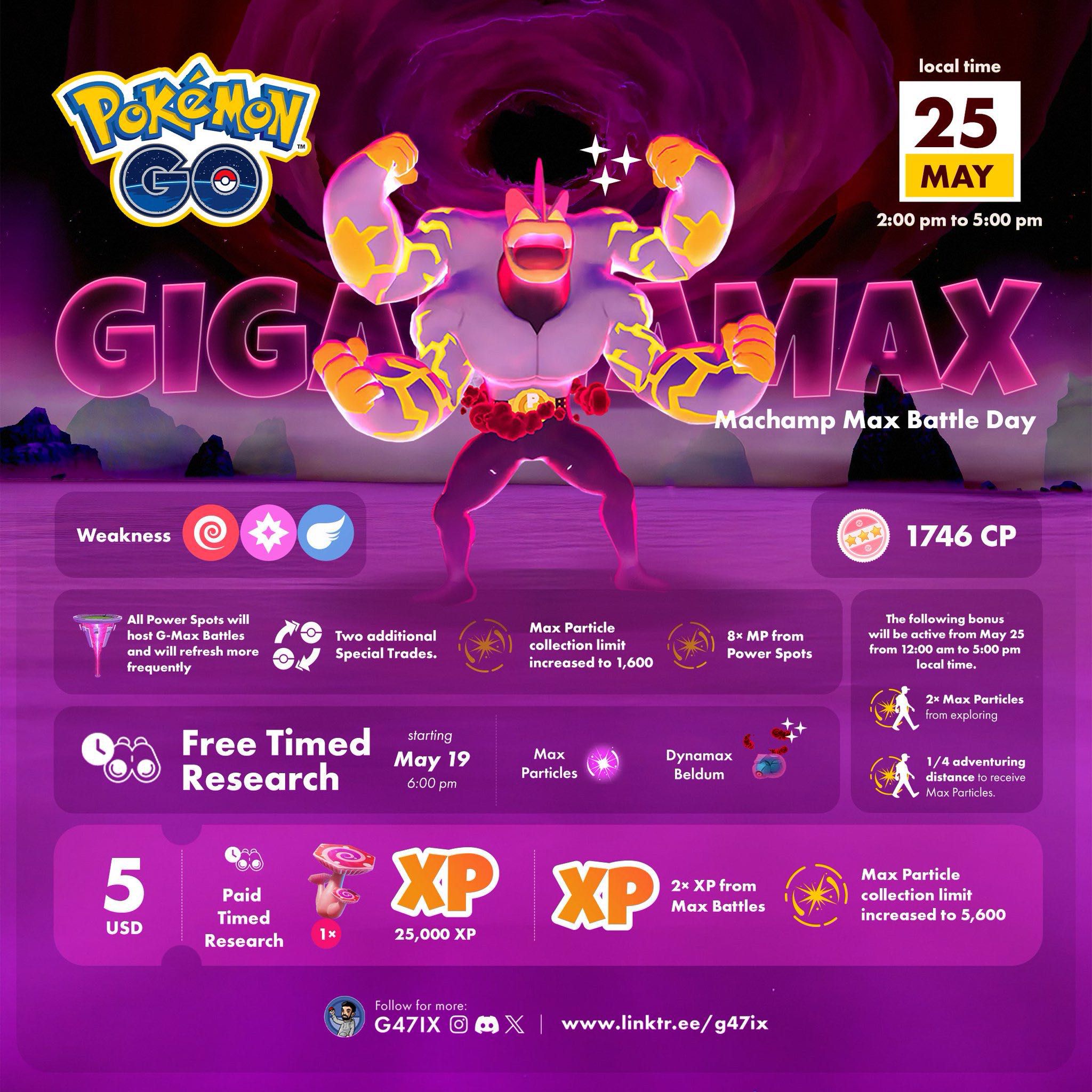 Op zondag 25 mei van 14.00 uur tot 17.00 uur lokale tijd kunnen we Gigantamax Machamp in de Max Battles tegenkomen. Gigantamax Machamp maakt hiermee zijn debuut in de 6 sterren Max Battles en je kunt hem ook direct Shiny treffen!