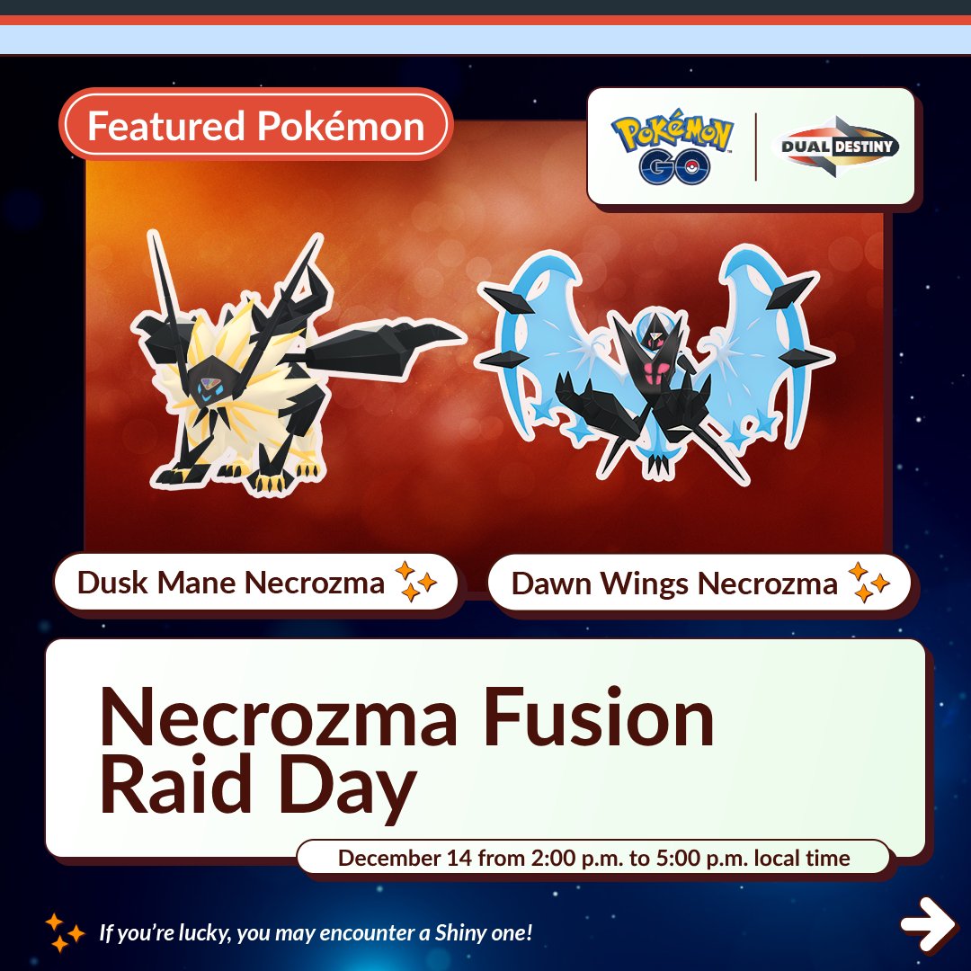 Op zaterdag 14 december zal er weer een Raid Day plaatsvinden en dit keer staan Dusk Mane Necrozma en Dawn Wings Necrozma centraal. Je kunt deze fusion vormen van 14.00 uur tot 17.00 uur lokale tijd vinden in raids. Als je één van deze raidbazen verslaat, kun je hierna Necrozma vangen. Necrozma is Shiny in het spel te verkrijgen.
