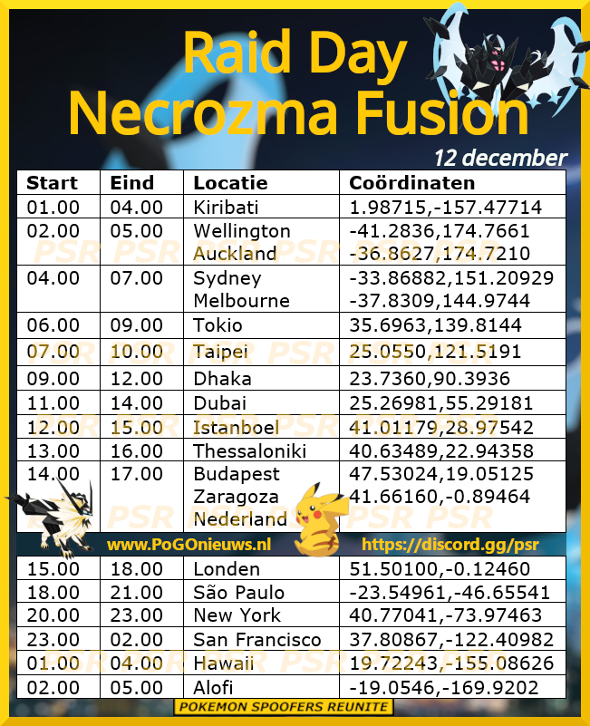 Op zaterdag 14 december zal er weer een Raid Day plaatsvinden en dit keer staan Dusk Mane Necrozma en Dawn Wings Necrozma centraal. Je kunt deze fusion vormen van 14.00 uur tot 17.00 uur lokale tijd vinden in raids. Als je één van deze raidbazen verslaat, kun je hierna Necrozma vangen. Necrozma is Shiny in het spel te verkrijgen.