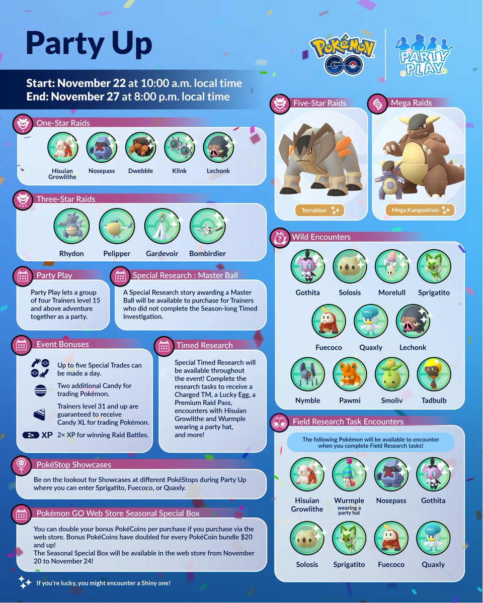 Op 22 november om 10.00 uur lokale tijd zal er weer een nieuw event starten en dit event staat in het teken van Party Play. Met Party Play kun je in een groep van maximaal 4 trainers Party Challenges aangaan en krijg je bij raids een bonus genaamd Party Power.