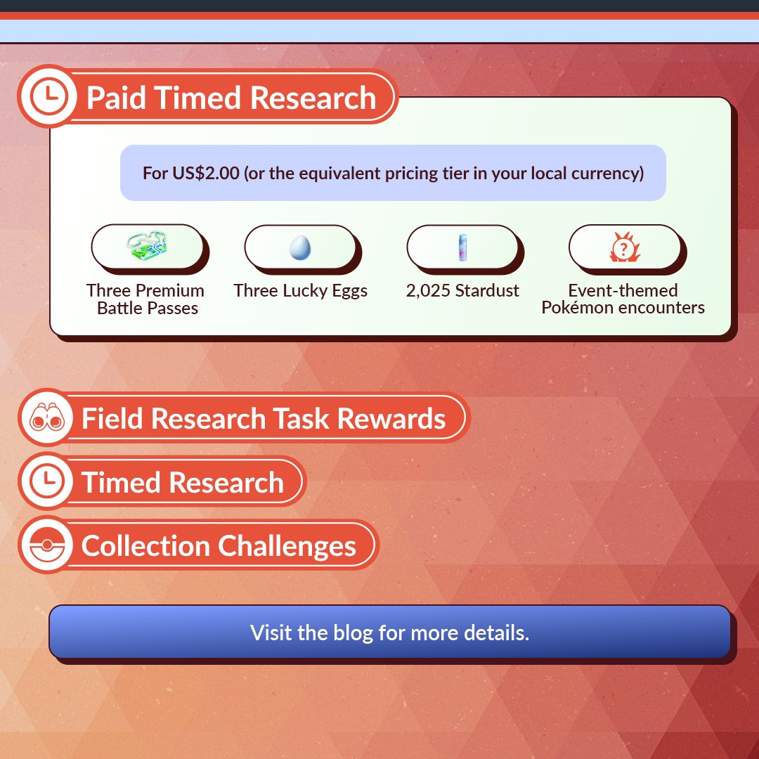 Er zullen weer verschillende event thema Field Research opdrachten zijn. De beloningen hieruit zijn verschillende event thema Pokémon.