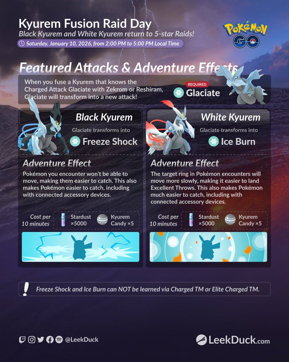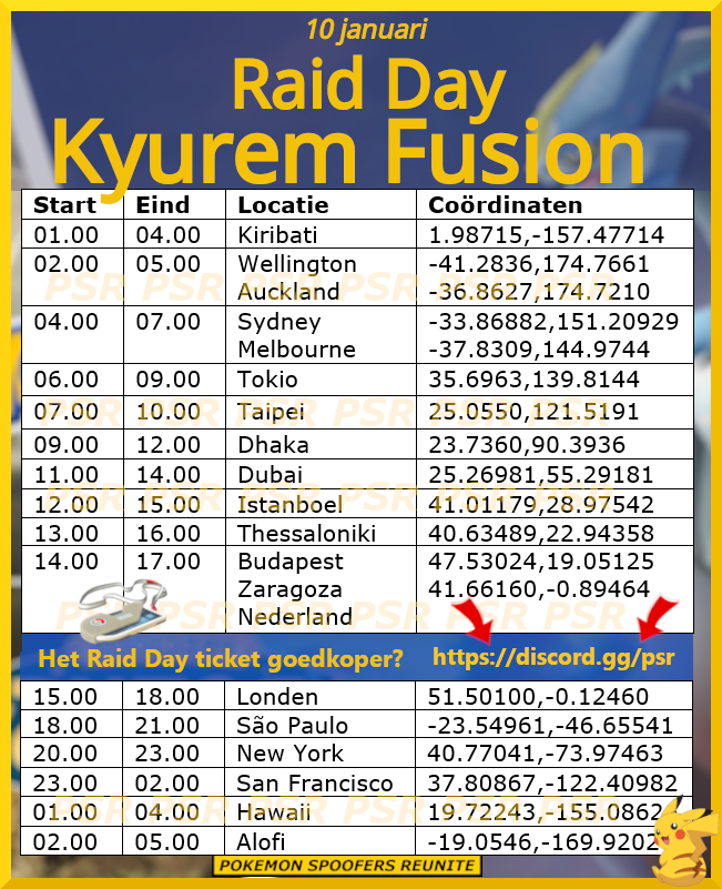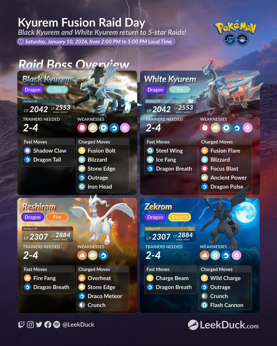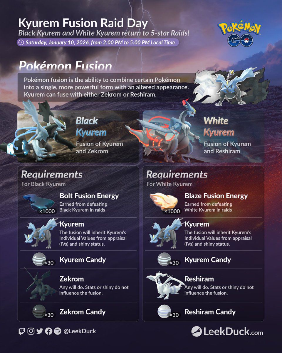 Op zaterdag 10 januari is er weer een Raid Day. Dit keer kunnen we raiden voor Kyurem, Reshiram en Zekrom en Fusion Energy. Tussen 14.00 uur en 17.00 uur lokale tijd kunnen we deze Pokémon vinden in de 5 sterren raids.