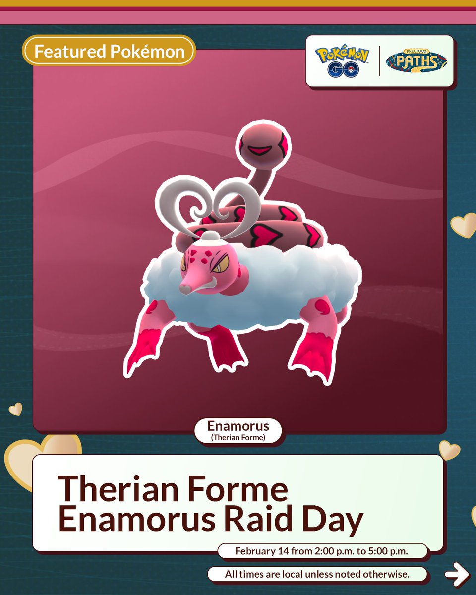 Op Valentijnsdag is er een Raid Day waarin Enamorus (Therian Forme) zijn Pokémon GO debuut maakt. Op 14 februari van 14.00 uur tot 17.00 uur lokale tijd kunnen we meedoen aan dit event. Een uitgelezen kans om samen romantisch te gaan raiden.