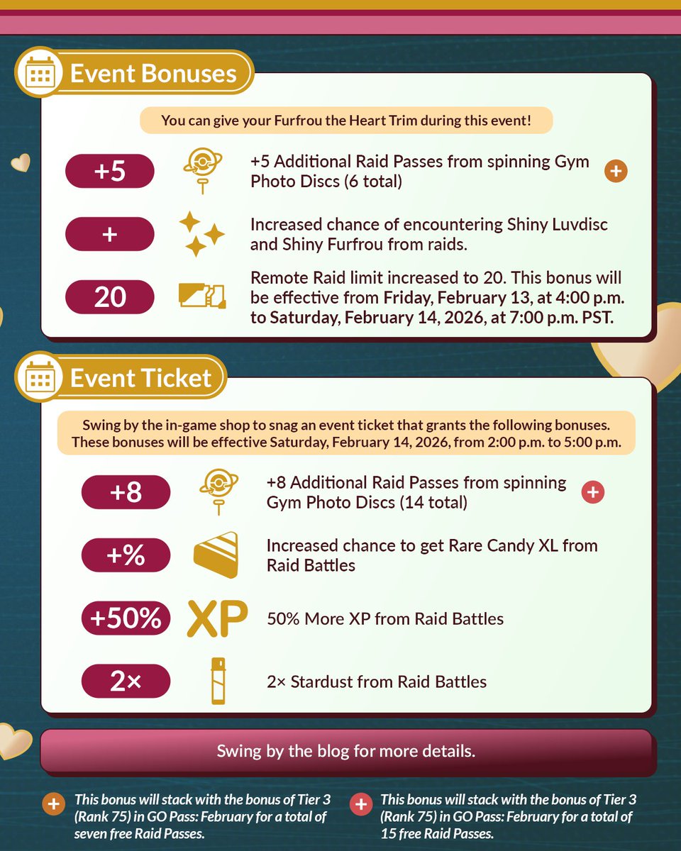- Verhoogde kans om Luvdisc of Furfrou shiny uit raids te krijgen;
