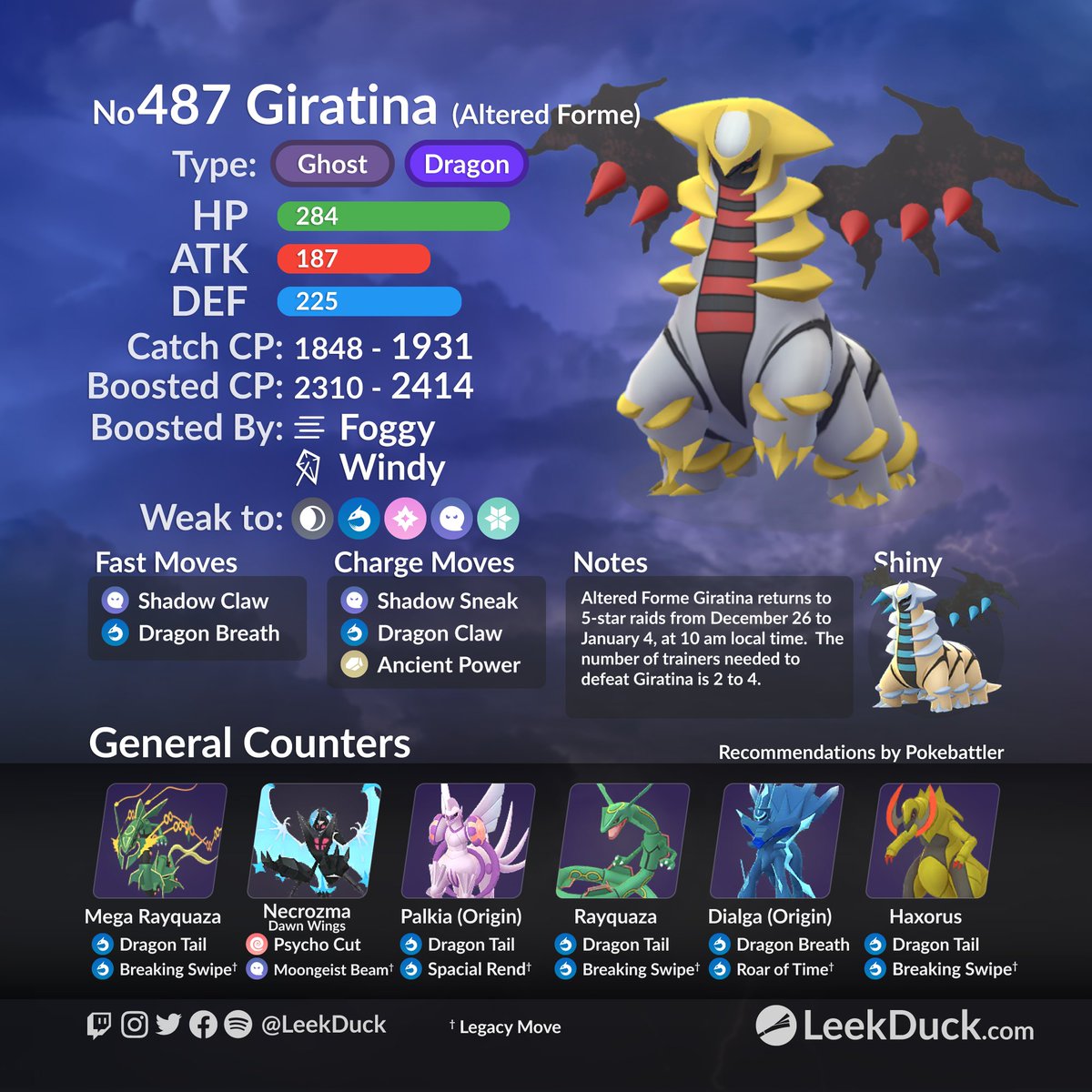 Op 1 januari van 18.00 uur tot 19.00 uur lokale tijd is er weer een Raid Hour. Deze keer zal Giratina (Altered Forme) in de 5 sterren raids aanwezig zijn. Giratina (Altered Forme) is Shiny te vangen.