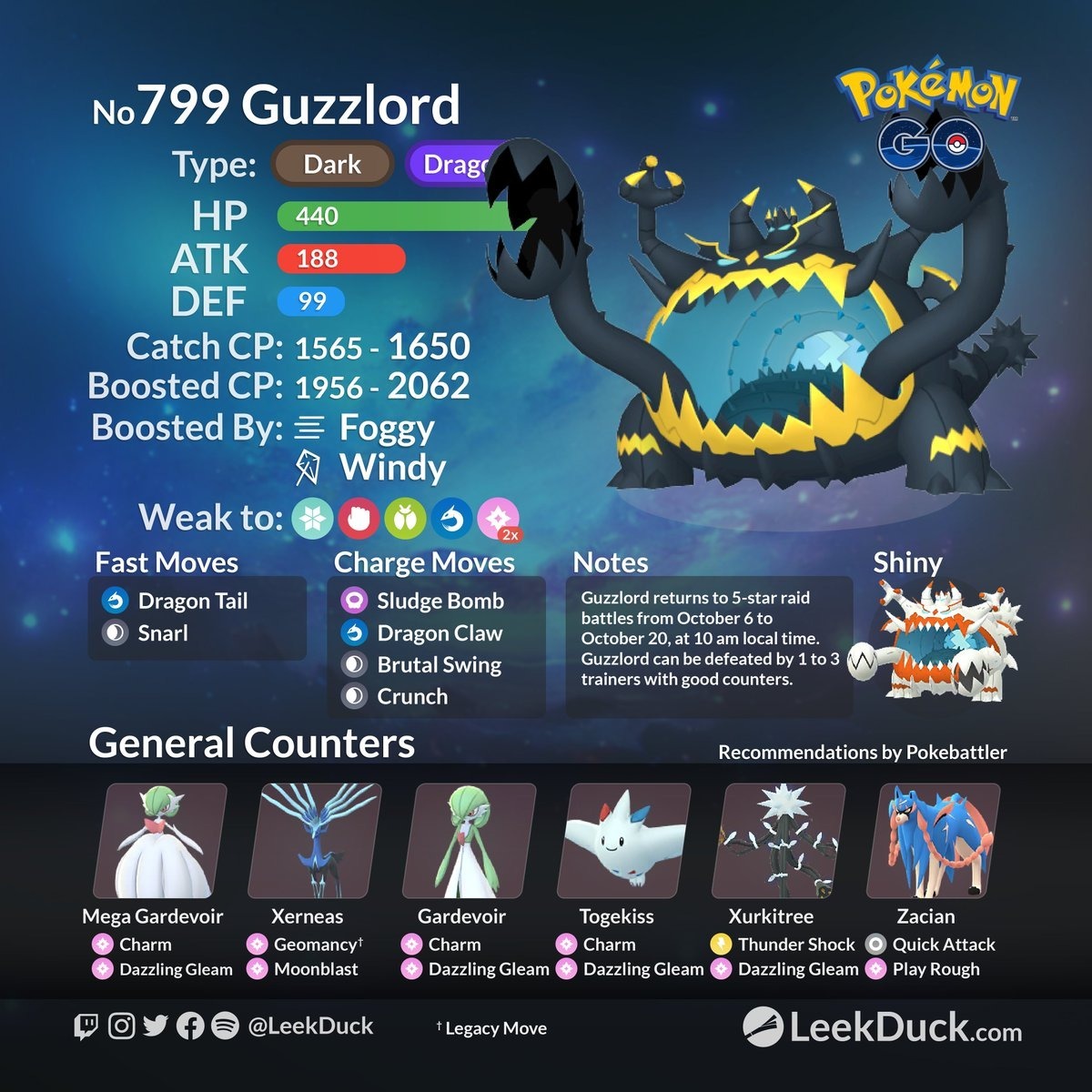 Op woensdag 11 oktober van 18.00 uur tot 19.00 uur lokale tijd is het weer tijd voor een Raid Hour. Dit keer kun je Guzzlord in de 5 sterren raids te vinden. Guzzlord is Shiny te vinden in het spel.