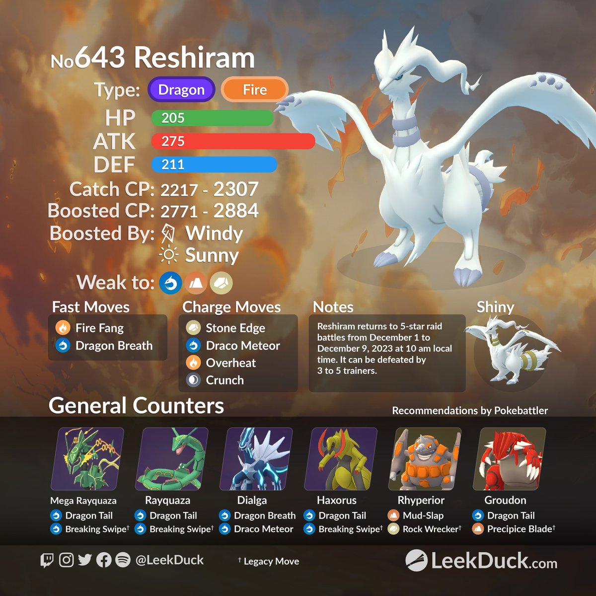 Op woensdag 6 december van 18.00 uur tot 19.00 uur lokale tijd is het weer tijd voor een Raid Hour. Dit keer kun je Reshiram in de 5 sterren raids vinden. Deze Pokémon is Shiny in het spel.
