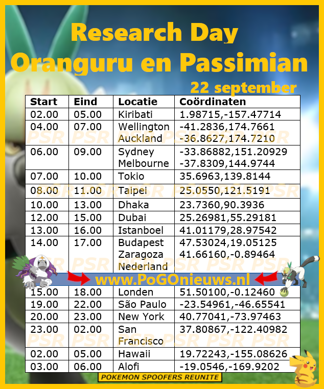 Op zondag 22 september van 14.00 uur tot 17.00 uur lokale tijd, is er weer een Research Day waarbij we Oranguru en Passimian krijgen uit de Field Research opdrachten. Oranguru is al enige tijd Shiny in het spel te verkrijgen maar Passimian zal zijn Shiny debuut maken.