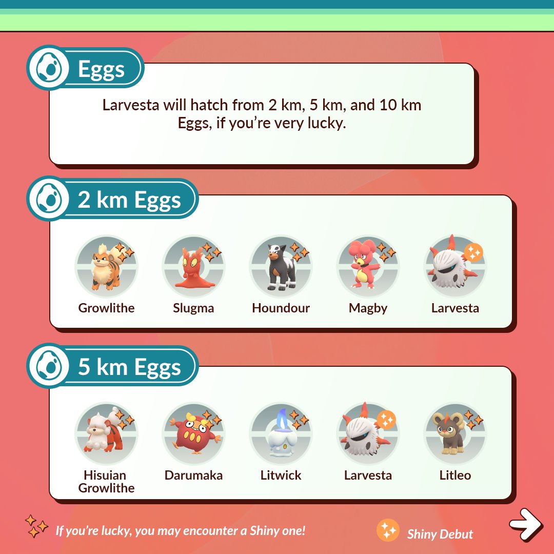 - 5 km eieren: Hisuian Growlithe, Darumaka, Litwick, Larvesta en Litleo;