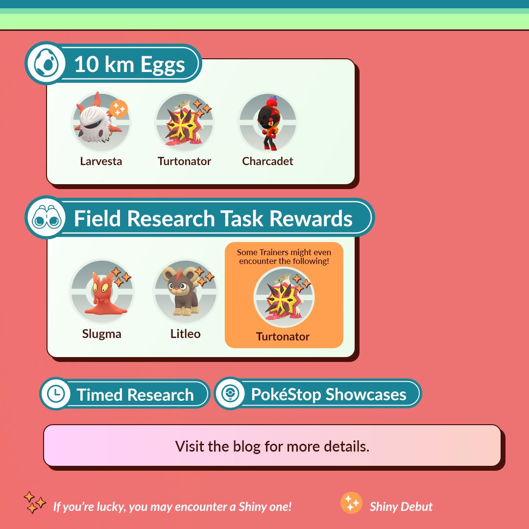 Uit de Field Research taken kun je Turtonator, Slugma en Litleo vrijspelen. Slugma en Litleo hebben een verhoogde kans om Shiny te zijn. De Timed Research zal alles te maken hebben met het uitlopen van eieren. Je kunt daarmee Stardust, XP en event Pokémon vrijspelen. Ook zullen er met dit event weer actieve PokéStop Showcases zijn waarin je een event Pokémon kunt plaatsen.