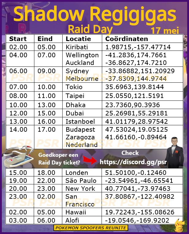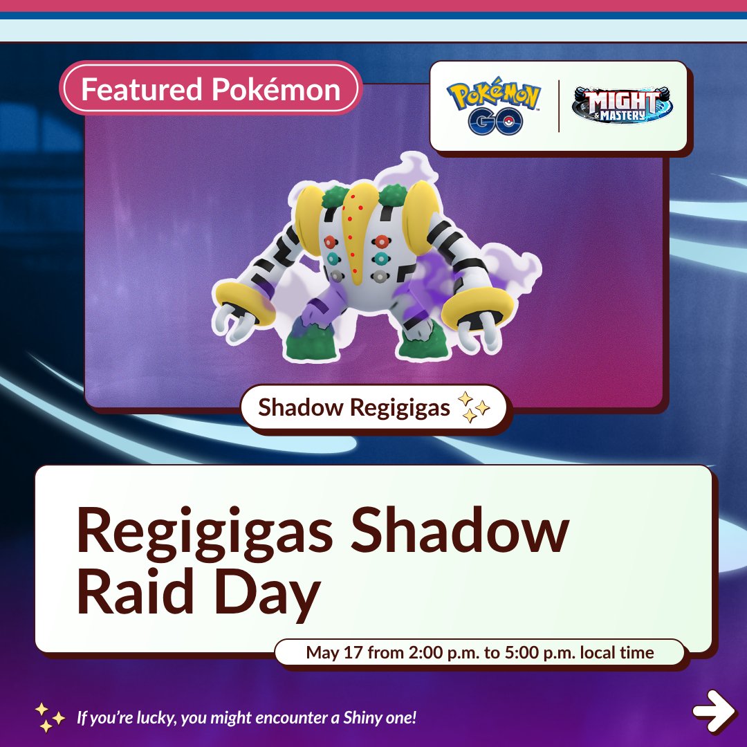 Op zaterdag 17 mei is er een Shadow Raid Day en dit keer mogen we Shadow Regigigas redden uit de handen van Giovanni. Tussen 14.00 uur en 17.00 uur lokale tijd kunnen we hiermee aan de slag.