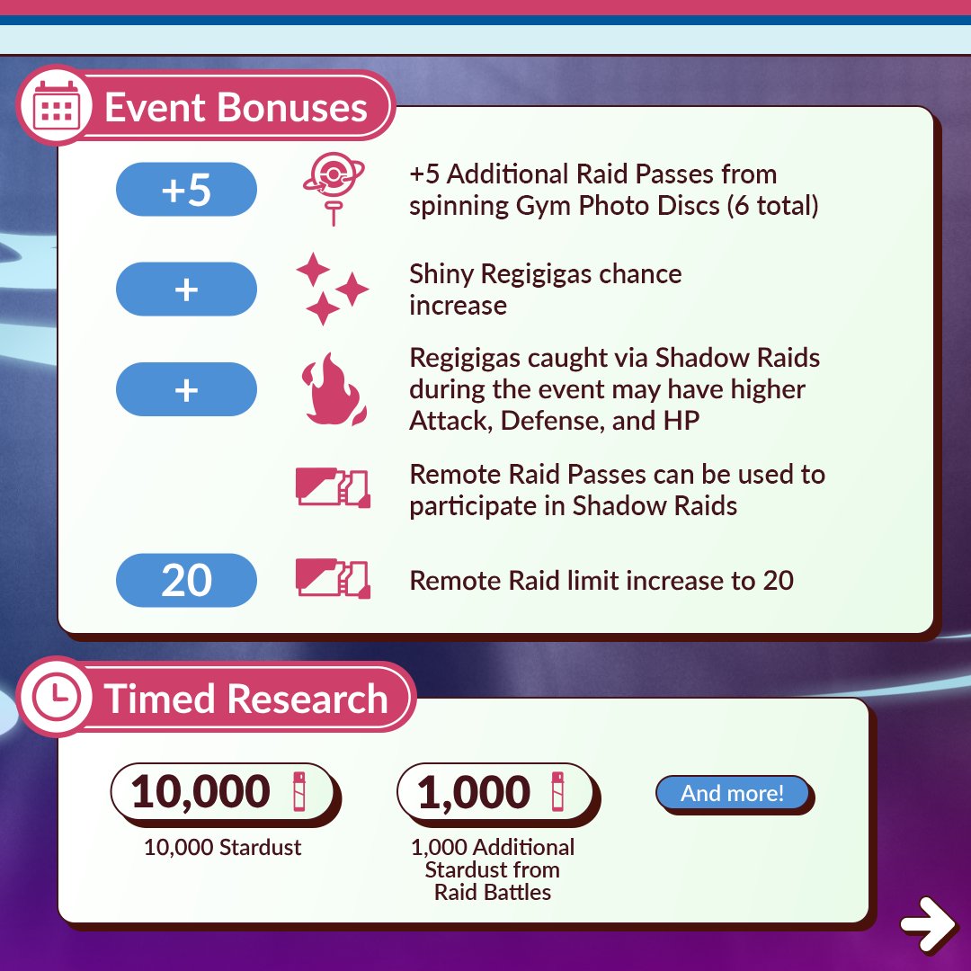 - Er is een verhoogde kans om Shiny Regigigas vrij te spelen vanuit Shadow Raids;