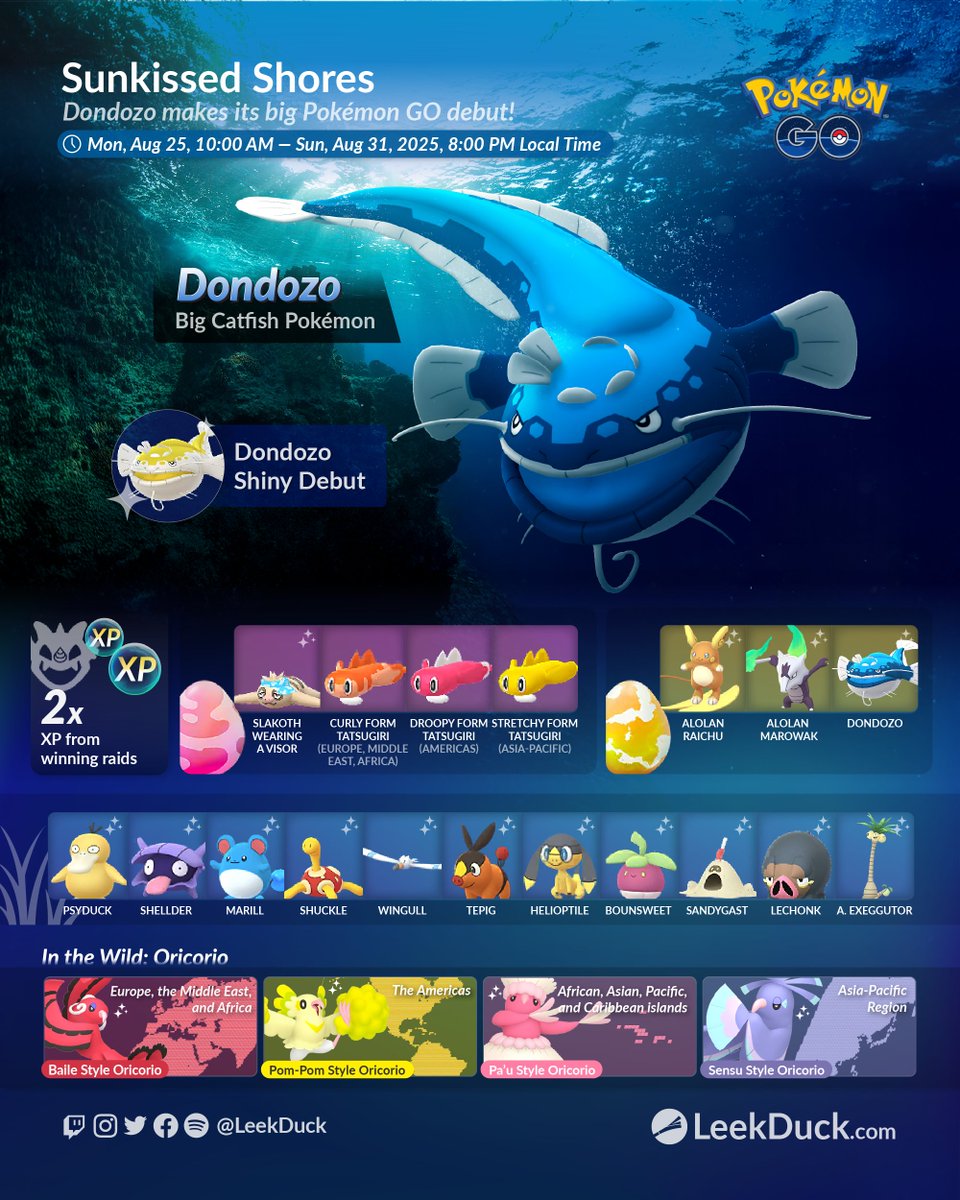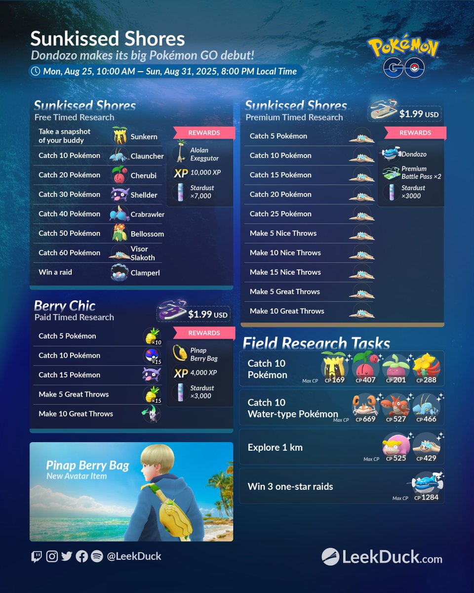 Op maandag 25 augustus start er een nieuw event namelijk het Sunkissed Shores event. Dondozo zal zijn spel debuut maken en je kunt deze Pokémon direct Shiny in het spel tegenkomen.