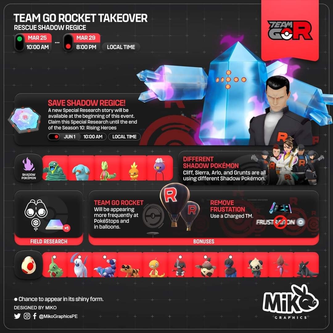 Met dit event komt er een nieuwe Special Research waarmee je na het verslaan van Giovanni een Shadow Regice kunt vrijspelen. Deze Special Research zal tot het einde van het seizoen te volbrengen zijn. Met dit event zullen er meer Team Go Rocket grunts bij PokéStops en in luchtballonnen voorbij komen. Ook kunnen we weer met een Charged TM de Charged Attack Frustration weghalen.