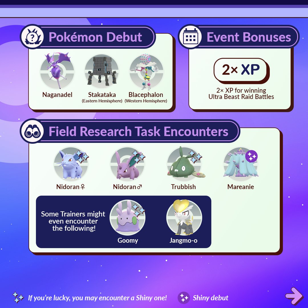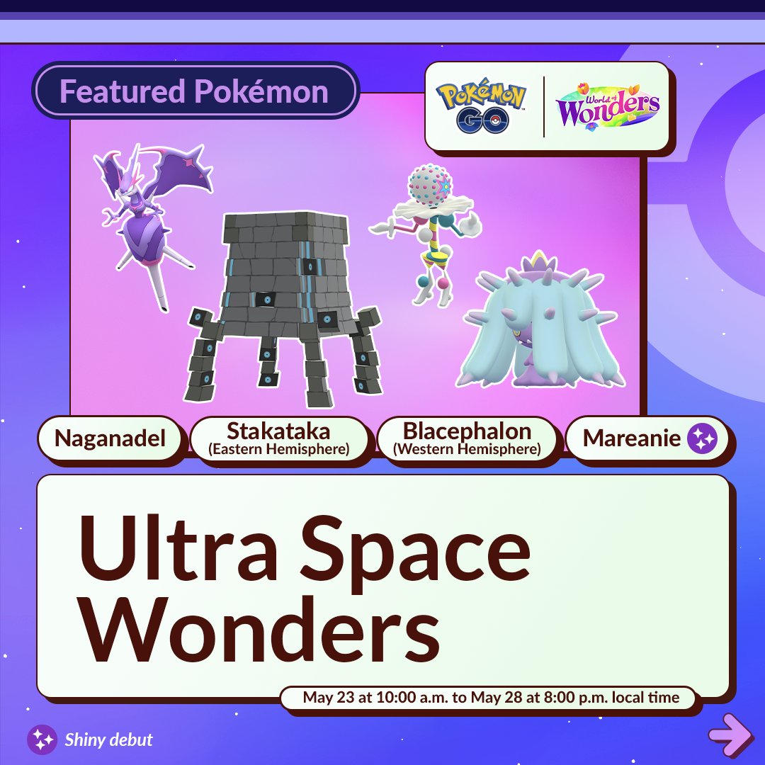 Op 23 mei om 10.00 uur lokale tijd zal het event ‘Ultra Space Wonders’ starten. Met dit event komen er nieuwe Pokémon in het spel en krijgen we ook een nieuwe Shiny. De Pokémon Stakataka en Blacephalon zullen in de 5 sterren raids plaatsnemen. Wel zijn deze raidbazen regio gebonden. De Pokémon Naganadel kun je krijgen door Poipole te evolueren en Mareanie komt Shiny in het spel. Kortom we kunnen weer aan de slag.