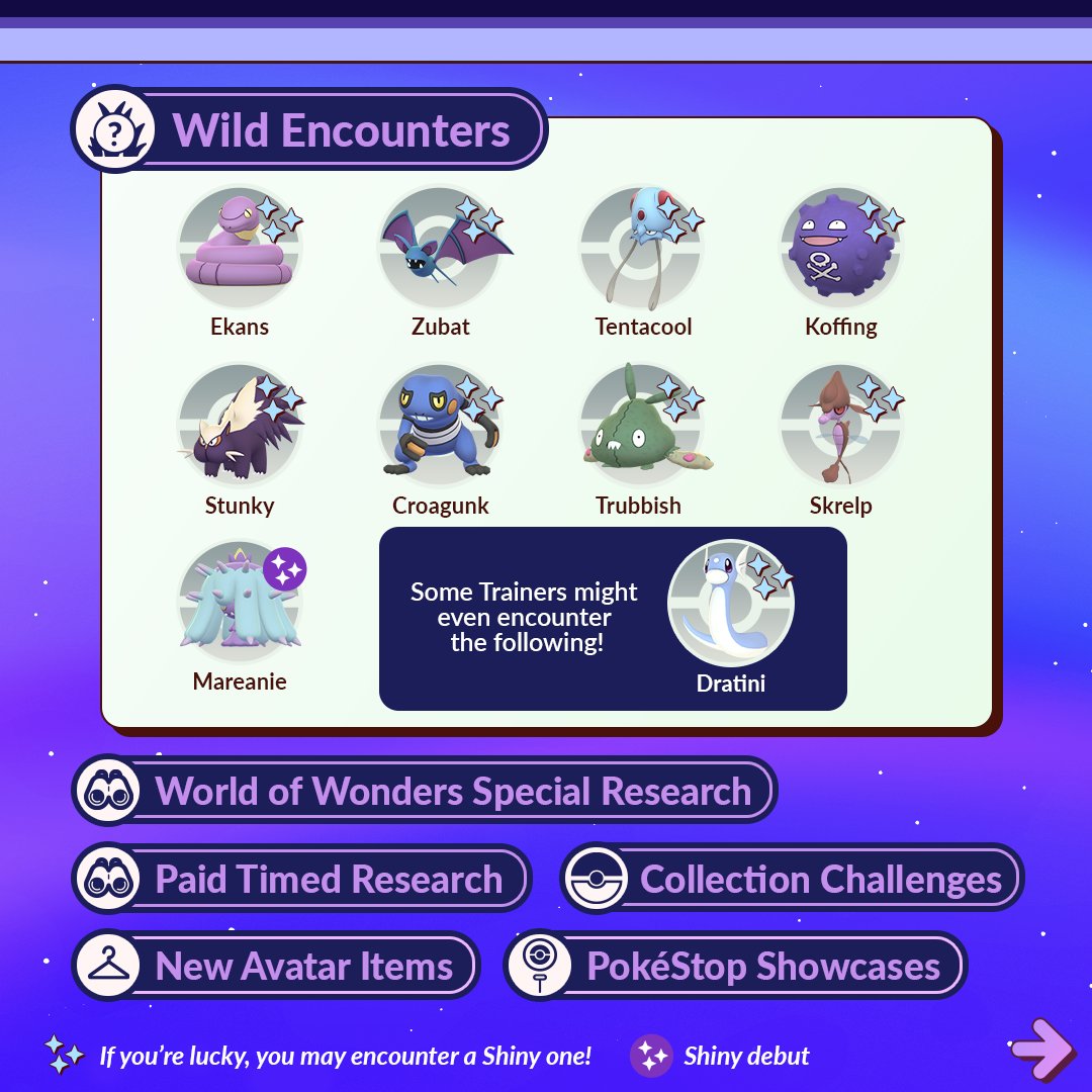 Voor het eerst komt Mareanie Shiny in het spel en gelukkig is deze Pokémon in het wild te vinden. Naast Mareanie kunnen we ook Ekans, Zubat, Tentacool. Koffing, Stunky, Croagunk, Trubbish, Skrelp en Dratini in het wild aantreffen.