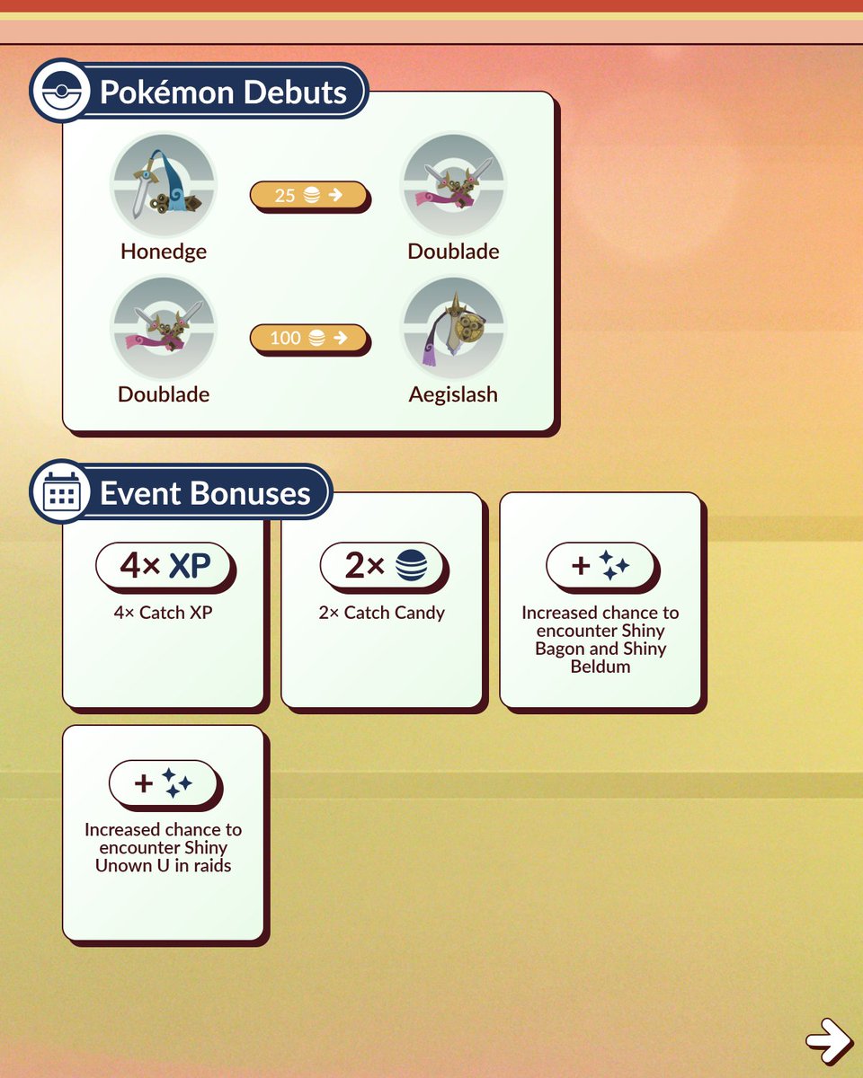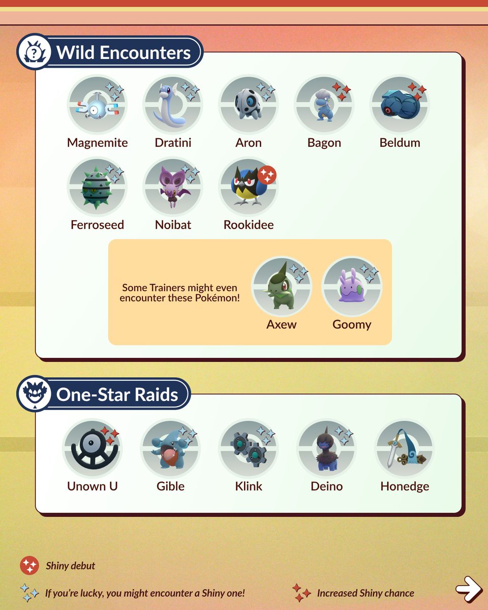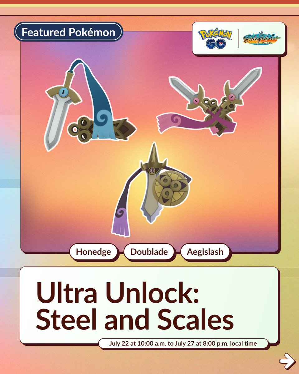 Op dinsdag 22 juli start er een nieuw event en dit event heet Ultra Unlock: Steel and Scales. Voor het eerst krijgen we Honedge, Doublade en Aegislash in het spel. Rookidee maakt zijn Shiny debuut en Unown U komt in raids.